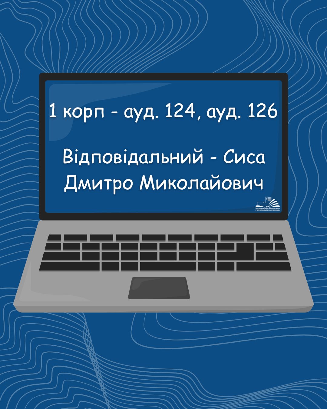 1 корпус – ауд. 124, ауд. 126 (відповідальний: Сиса Дмитро Миколайович)