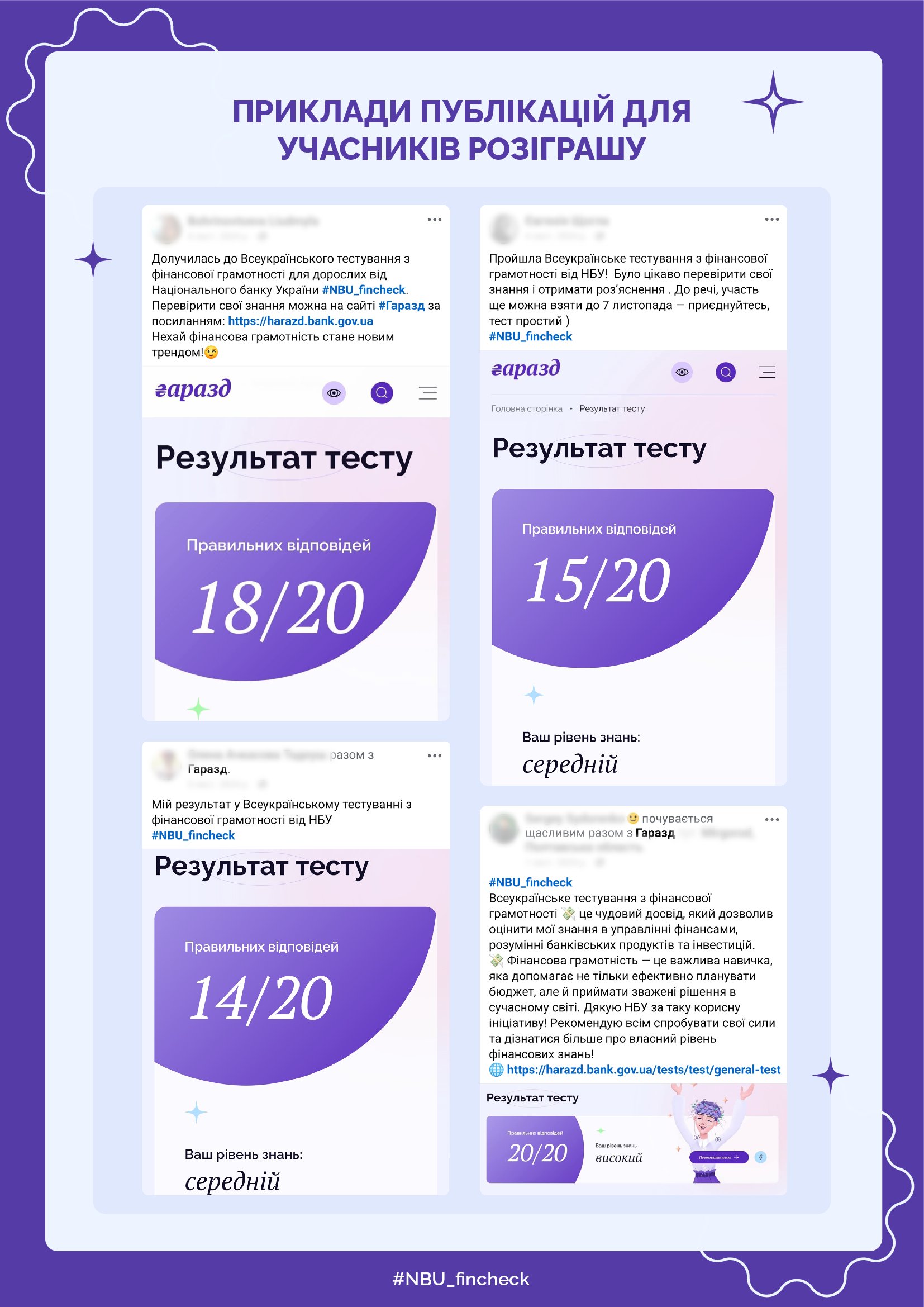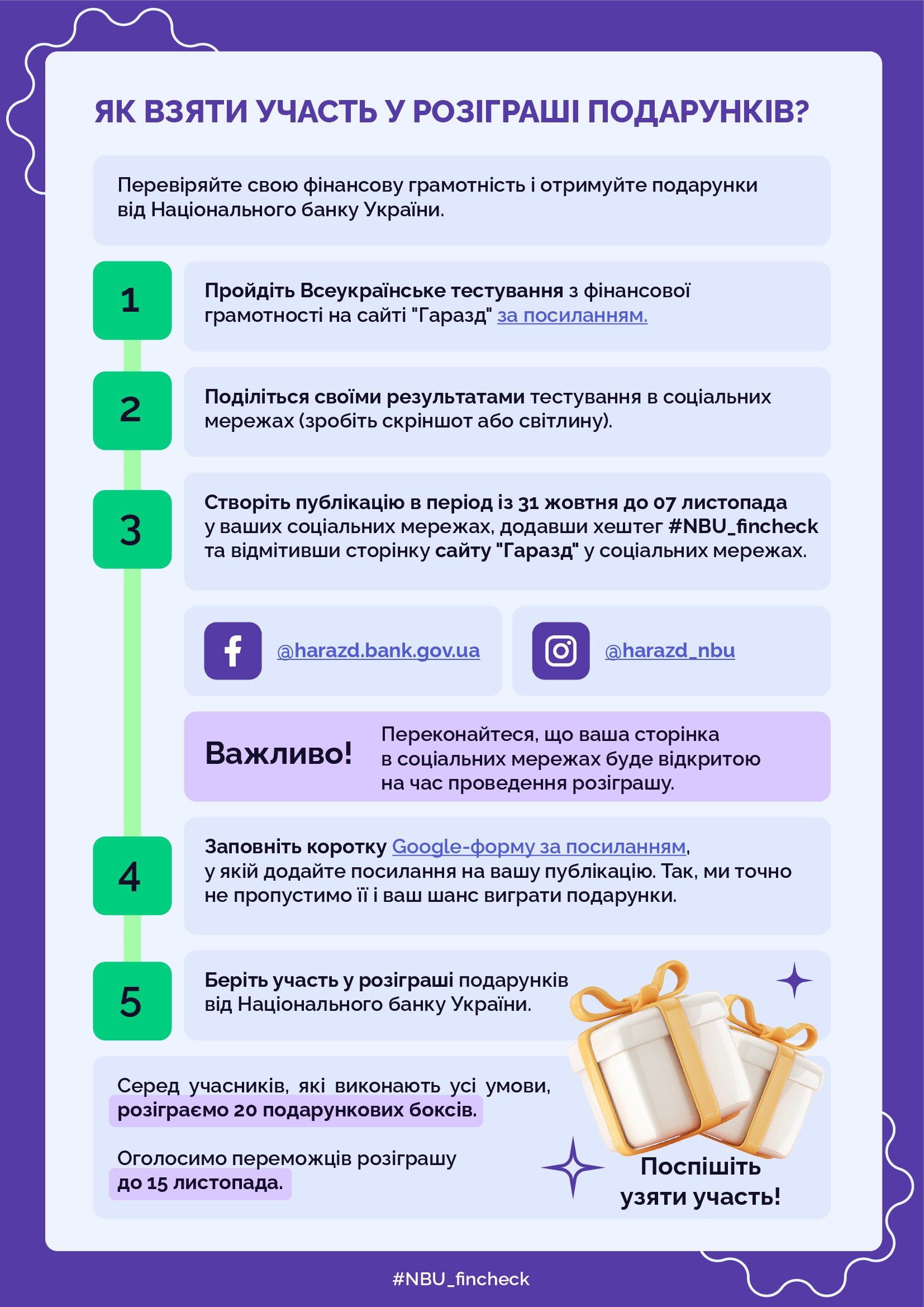 Тест з’явиться 31 жовтня на освітньому сайті «Гаразд»: https://harazd.bank.gov.ua, пройти його можна до 7 листопада 2025 року.