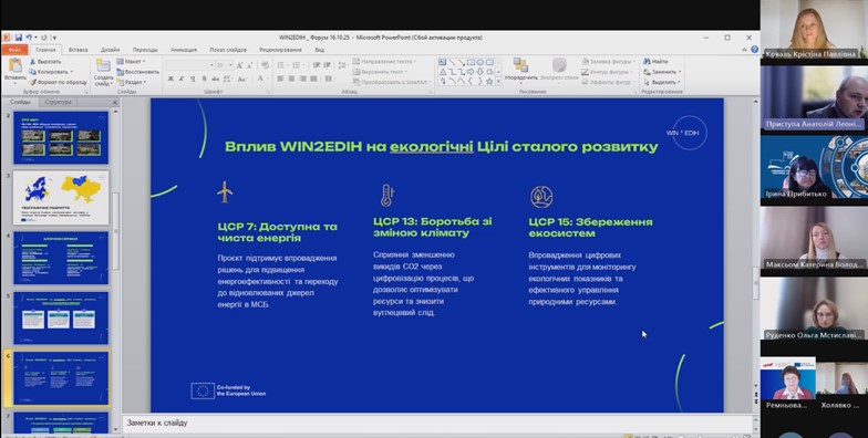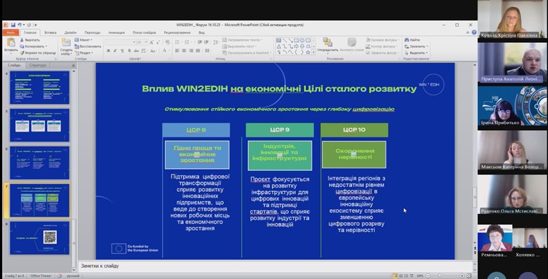 У межах сесії виступів координаторів міжнародних ініціатив було представлено проєкт WIN-WIN EDIH (WIN2EDIH) – ініціативу, що спрямована на поєднання української та європейської цифрових екосистем через інновації, підтримку МСП, розвиток людського капіталу та цифрової грамотності населення. Презентацію здійснив проректор з наукової роботи НУ «Чернігівська політехніка» Анатолій Приступа, який наголосив на значенні проєкту для розвитку регіональних цифрових інноваційних хабів та посилення співпраці з ЄС. У своєму виступі Анатолій Леонідович акцентував увагу учасників Форуму на тому, що проєкт WIN2EDIH робить вагомий внесок у досягнення Цілей сталого розвитку ООН, зокрема: