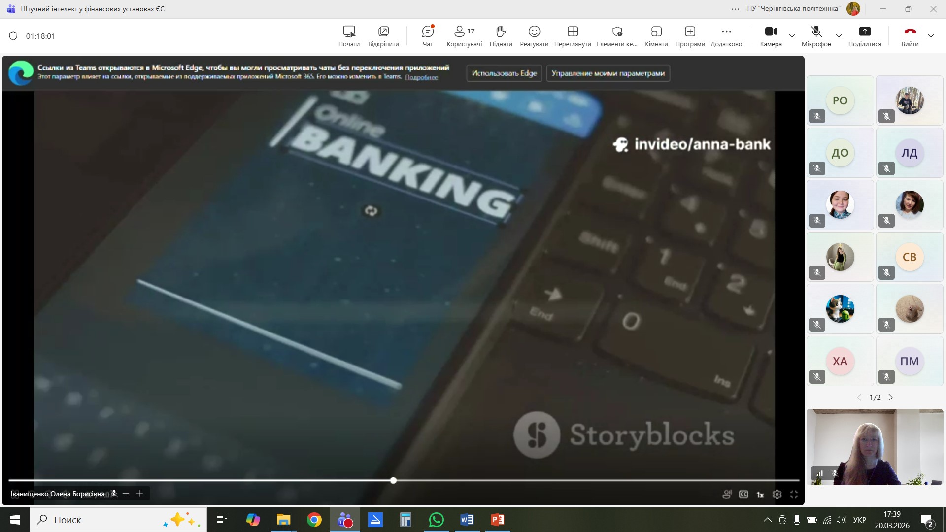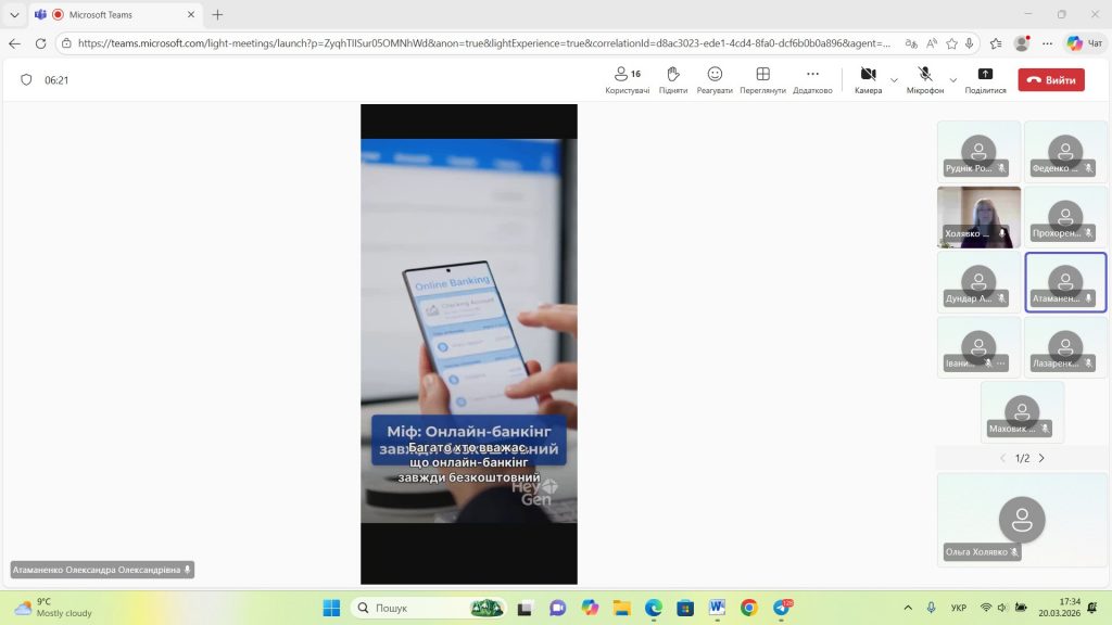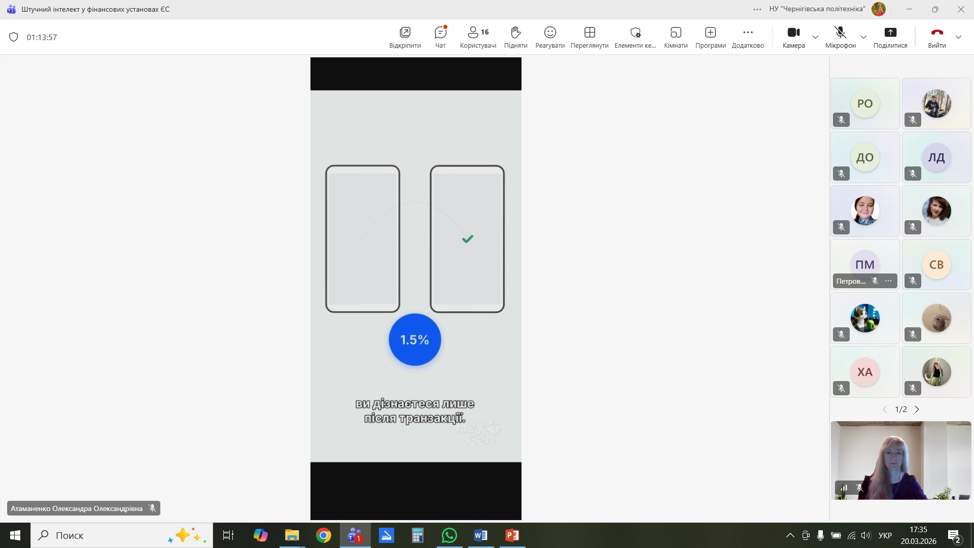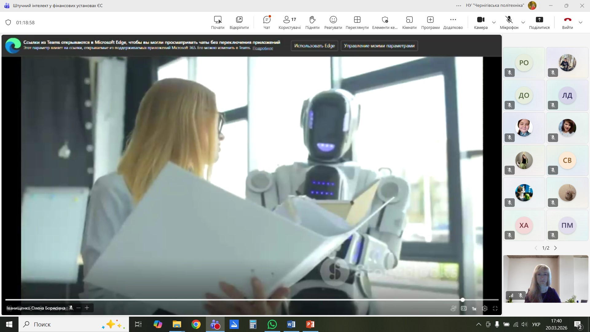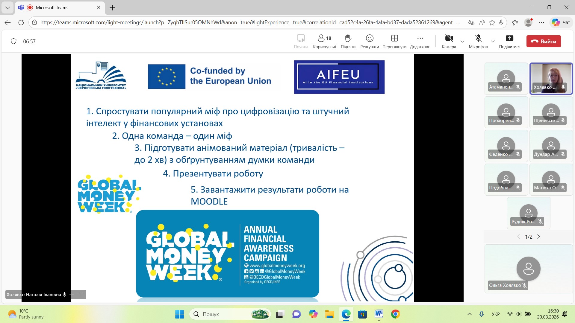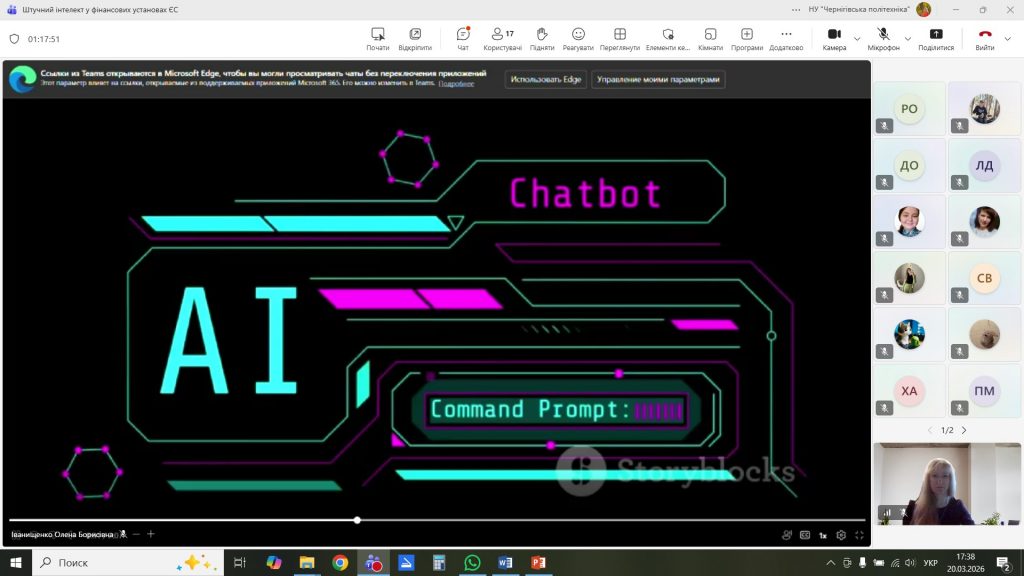 20 березня 2026 року у межах ініціативи Global Money Week відбулося тематичне навчальне заняття, організоване в онлайн-форматі в рамках викладання курсу «Штучний інтелект у фінансових установах ЄС». Заняття провела професор кафедри фінансів, банківської справи та страхування, координатор проєкту ERASMUS+ AIFEU Наталія Холявко. Учасниками заходу стали слухачі курсу «Штучний інтелект у фінансових установах ЄС», зокрема здобувачі вищої освіти різних спеціальностей і курсів Національного університету «Чернігівська політехніка», а також представники інших закладів вищої освіти України.