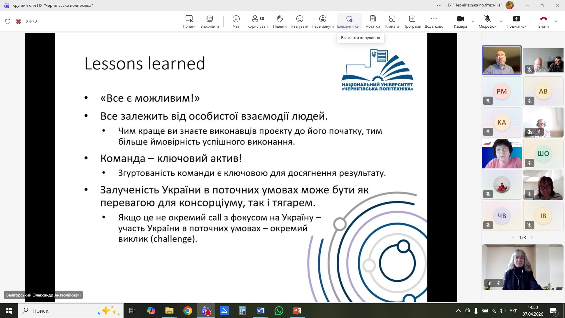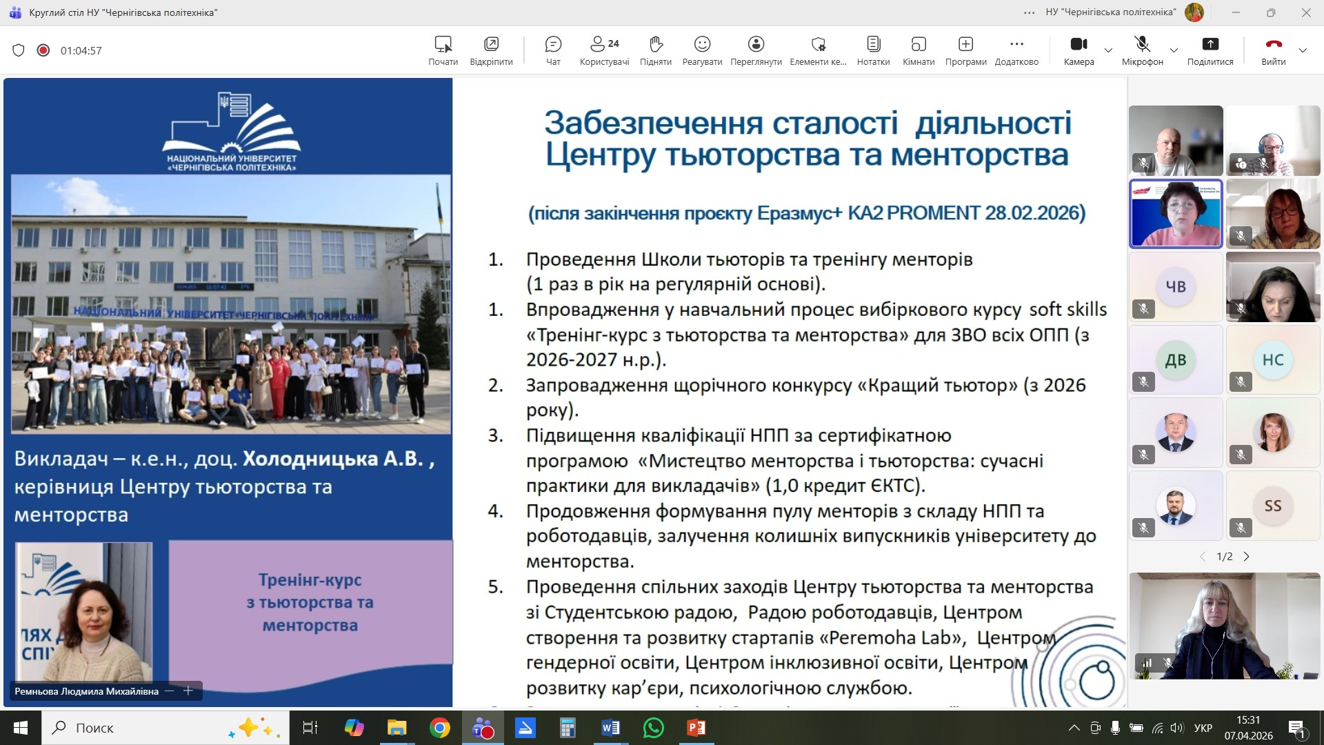 7 квітня 2026 року представники команди проєкту AIFEU «Штучний інтелект у фінансових установах ЄС» взяли участь у роботі круглого столу «Сталість результатів міжнародних проєктів: досвід, інсайти, рекомендації», що відбувся на базі Національного університету «Чернігівська політехніка» та був присвячений питанням сталості результатів міжнародних проєктів, обміну досвідом та виробленню практичних рекомендацій. У межах заходу представники завершених у 2025 році міжнародних проєктів університету поділилися досвідом реалізації низки проєктних ініціатив та приділили особливу увагу питанням інтеграції напрацювань проєктів у освітній процес, розвитку партнерських мереж, підвищення інституційної спроможності закладу вищої освіти та забезпечення сталості та довготривалого впливу проєктної діяльності. Спікери круглого столу акцентували увагу на таких аспектах: