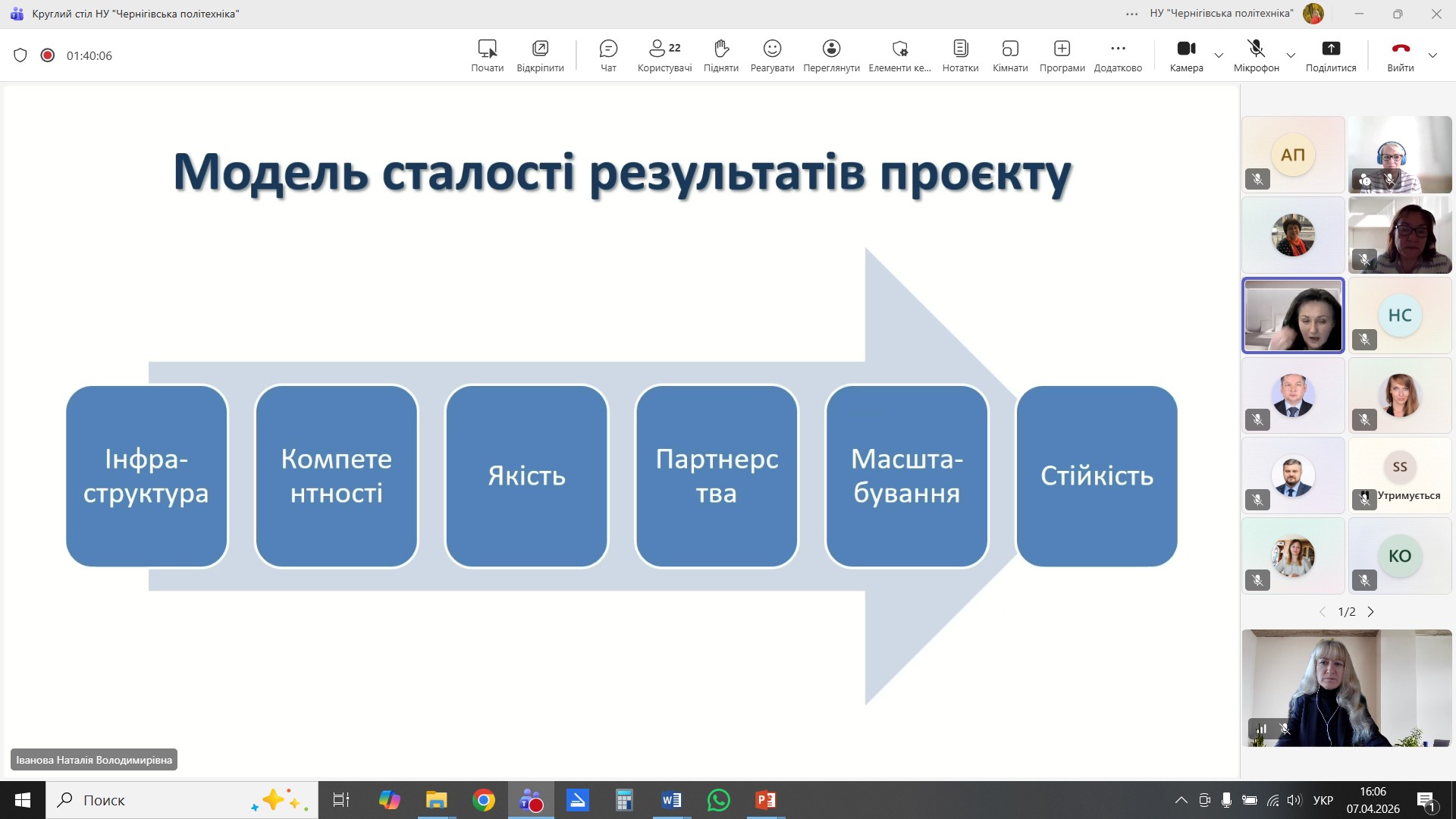 7 квітня 2026 року представники команди проєкту SUSTED «Освіта для сталого розвитку: синергія компетенцій для відновлення України» взяли участь у роботі круглого столу «Сталість результатів міжнародних проєктів: досвід, інсайти, рекомендації», що відбувся на базі Національного університету «Чернігівська політехніка» та був присвячений питанням сталості результатів міжнародних проєктів, обміну досвідом та виробленню практичних рекомендацій. У межах заходу представники завершених у 2025 році міжнародних проєктів університету поділилися досвідом реалізації низки проєктних ініціатив та приділили особливу увагу питанням інтеграції напрацювань проєктів у освітній процес, розвитку партнерських мереж, підвищення інституційної спроможності закладу вищої освіти та забезпечення сталості та довготривалого впливу проєктної діяльності. Спікери круглого столу акцентували увагу на таких аспектах: