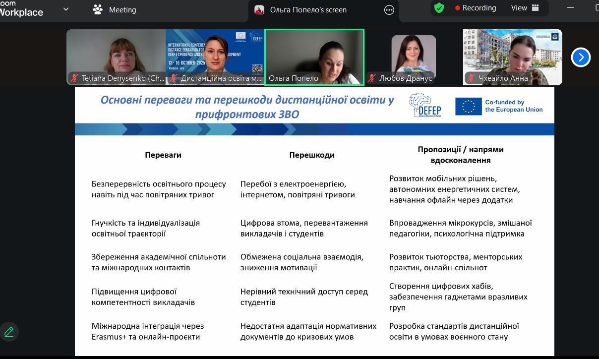 Другий раунд конференції передбачав поширення досвіду проєкту DEFEP у партнерських університетах. Значна увага була приділена проведенню панельних дискусій зокрема і за темою «Дистанційна освіта у прифронтових ЗВО: переваги та перешкоди» до яких долучився і НУ «Чернігівська політехніка», спікер Ольга Попело, д.е.н., професор кафедри Менеджменту та адміністрування.
