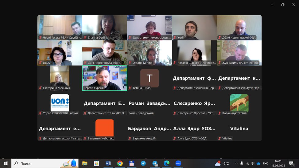 Декілька місяців напруженої роботи в рамках проєкту RELEVE, що впроваджується в Україні агенцією міжнародної технічної допомоги Expertise France, завершилися 18 лютого 2025 року засіданням робочої групи, до складу якої увійшли представники різних департаментів Чернігівської ОДА та інших органів місцевого самоврядування, а також колектив розробників Програми комплексного відновлення Чернігівської області, зокрема керівник Центру співпраці Університет – місто Жанна Дерій, яка залучалась як експерт та працювала на розділом програми екологічної сталості та захисту довкілля. На засіданні було презентовано проєкт Програми, з яким можна ознайомитися на сайті Чернігівської ОДА.