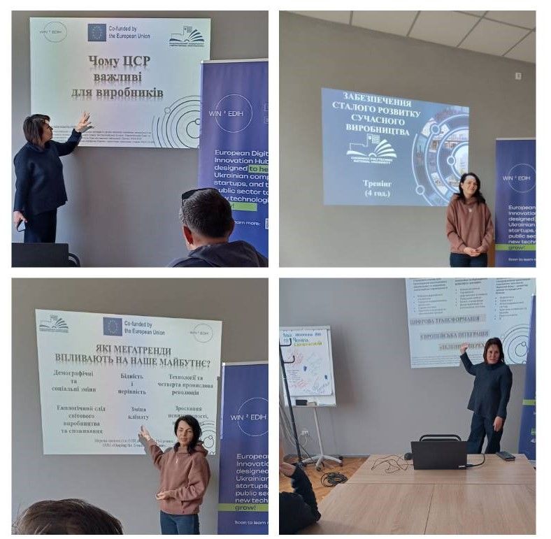 17 квітня 2026 року у рамках проєкту «Європейський цифровий інноваційний хаб WIN2EDIH» відбувся тренінг на тему «Забезпечення сталого розвитку сучасного виробництва». Захід було проведено в оффлайн-форматі на базі Національного університету «Чернігівська політехніка». Тренерами виступи доценти кафедри економіки, обліку і оподаткування, кандидати економічних наук, які мають значний досвід у сфері сталого розвитку та економіки підприємства Наталія Шадура-Никипорець та Оксана Мініна.