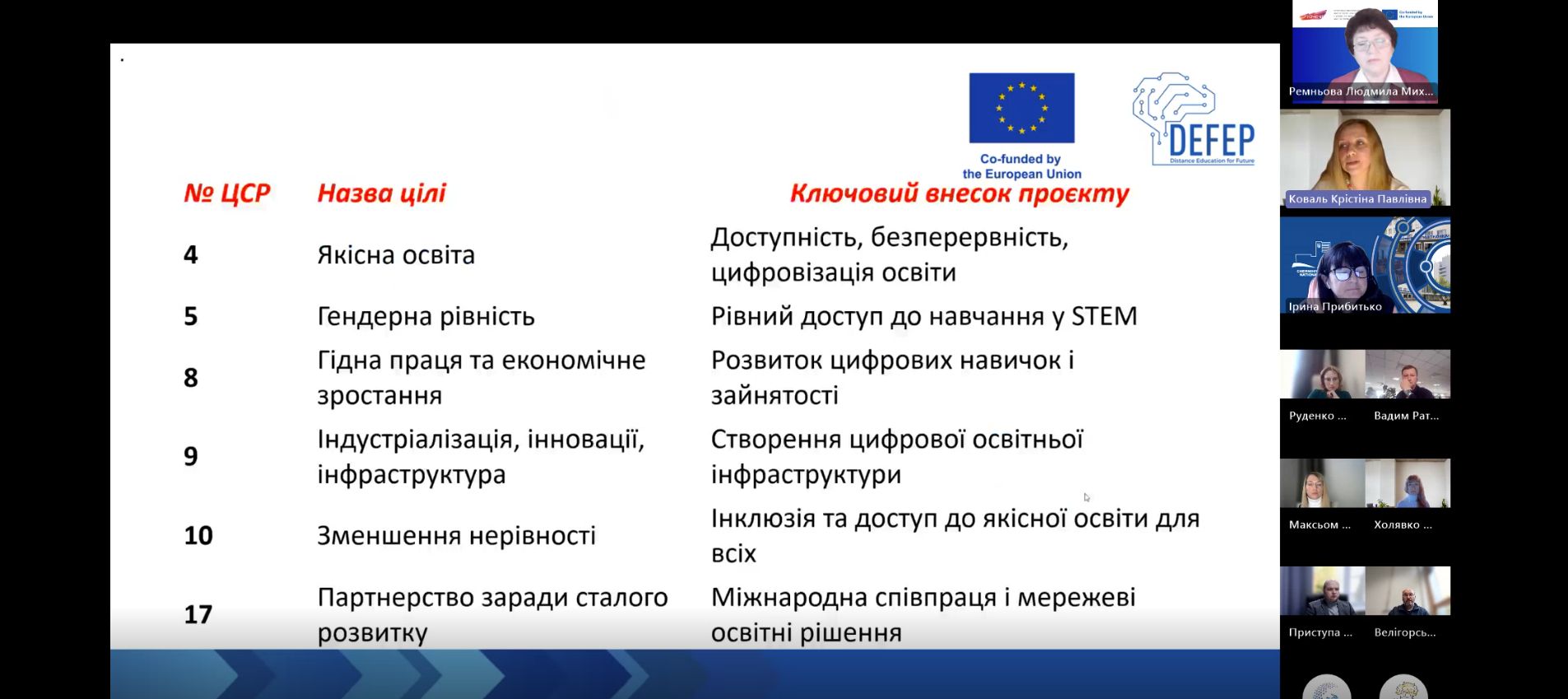 Низка сформованих напрацювань – доступність, безперервність, цифровізація освіти; рівний доступ до навчання у STEM; розвиток цифрових навичок і зайнятості, інклюзія та доступ до якісної освіти для всіх; міжнародна співпраця і мережеві освітні рішення – демонструють як безпосередній, так і опосередкований вплив реалізації проєкту DEFEP на досягнення щонайменше шести Цілей сталого розвитку.