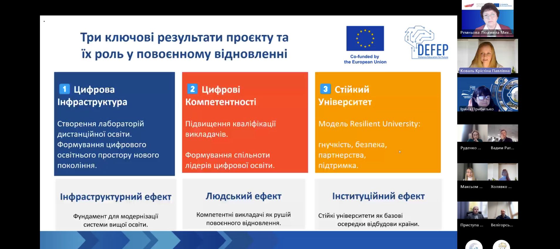 Під час презентації проєкту – спікер Крістіна Коваль д. філософії, доцент кафедри ПіТ – було висвітлено спрямованість проєкту на впровадження сталої та ефективної системи дистанційної освіти як окремої та незалежної форми навчання.