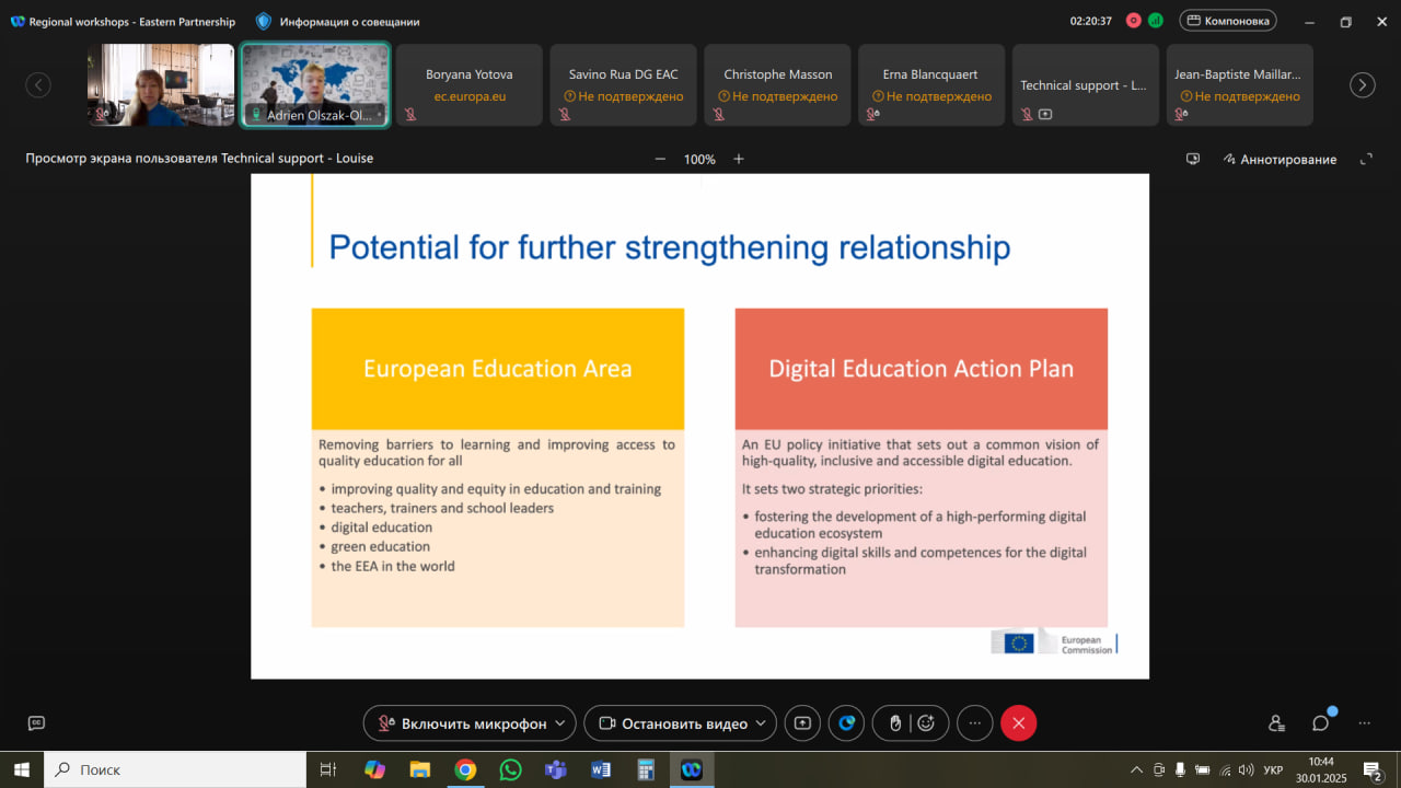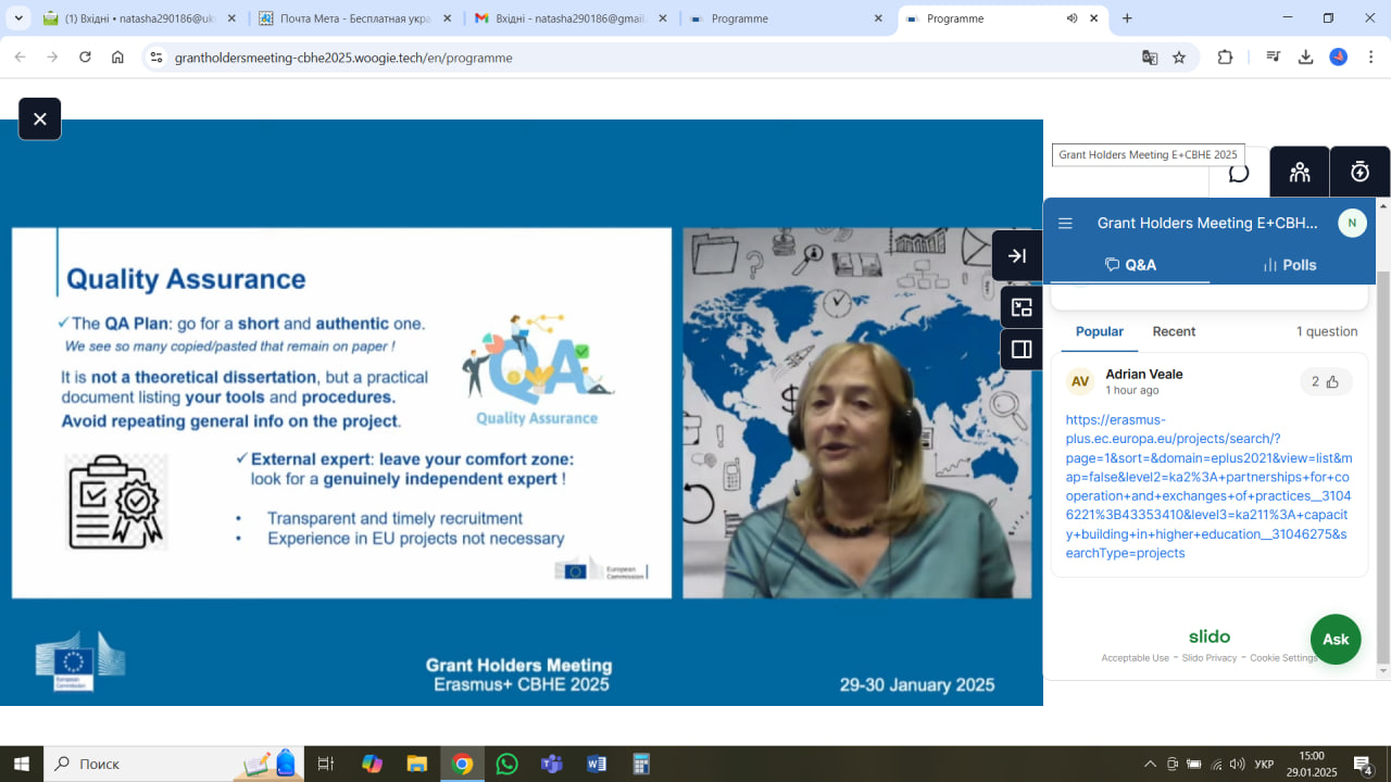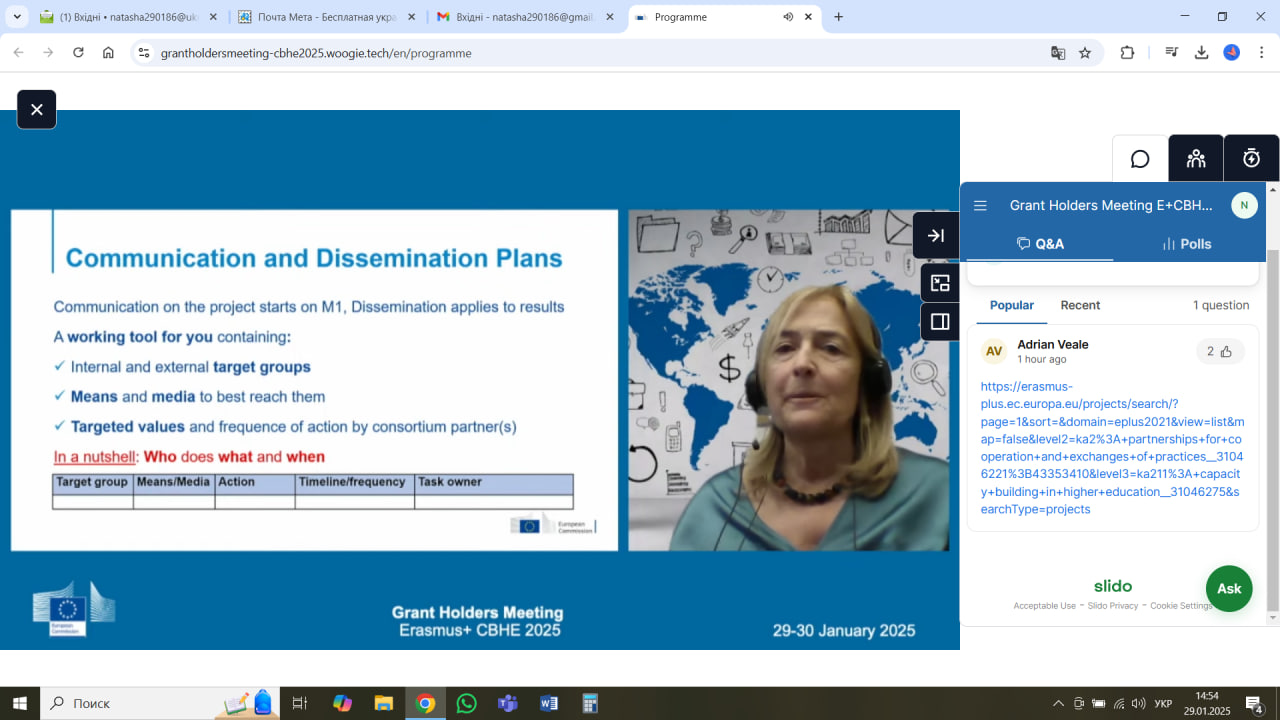 29 січня зустрічі було присвячено обговоренню актуальних питань реалізації проєктів у сфері вищої освіти в межах програми Erasmus+. Учасники заходу мали можливість ознайомитися з ключовими аспектами впровадження проєктів, результатами конкурсного відбору 2024 року, рекомендаціями щодо моніторингу та управління проєктами, а також питаннями захисту даних та аудиту.