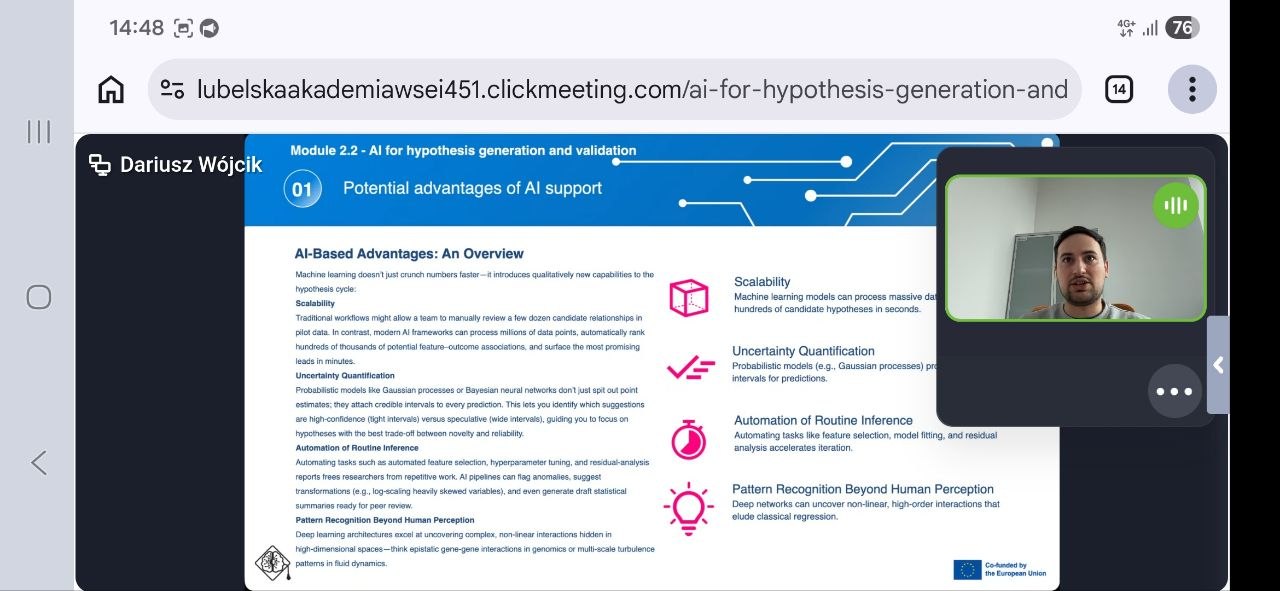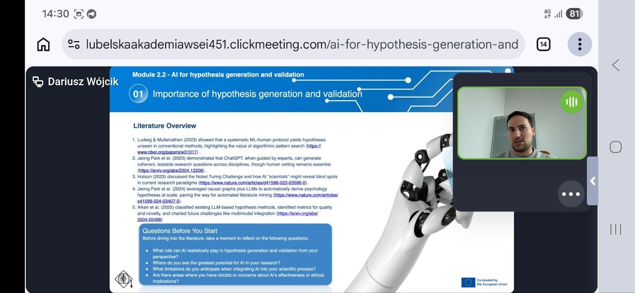 Ключовим спікером заходу виступив Dariusz Wójcik, викладач WSEI University (Польща), який представив сучасні інструменти штучного інтелекту для підтримки дослідницької діяльності. У ході вебінару було продемонстровано можливості застосування AI-рішень для генерації наукових ідей, аналізу даних, а також тестування гіпотез, що суттєво підвищує ефективність і швидкість наукових досліджень. Окрему увагу було приділено міждисциплінарному підходу до інтеграції штучного інтелекту у сферу вищої освіти, зокрема в контексті викладання, наукової роботи та адміністративних процесів.