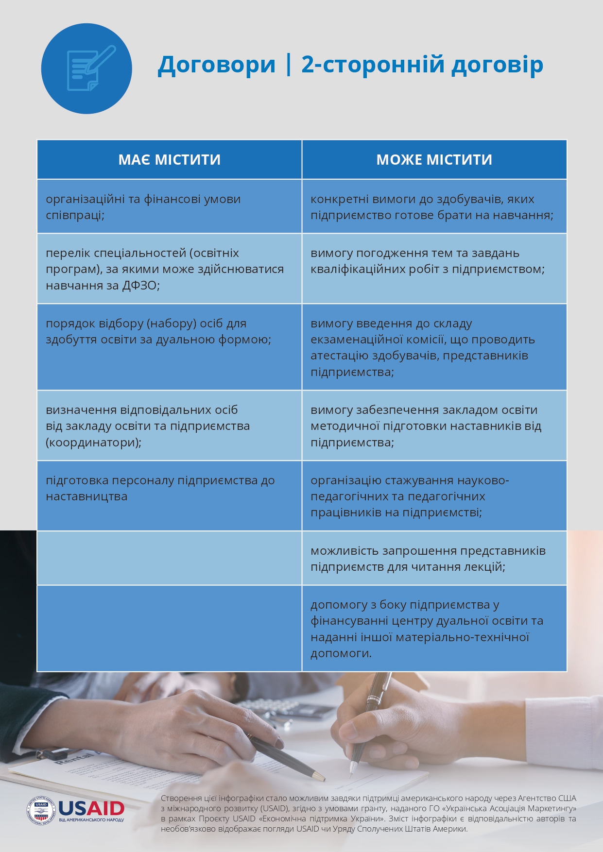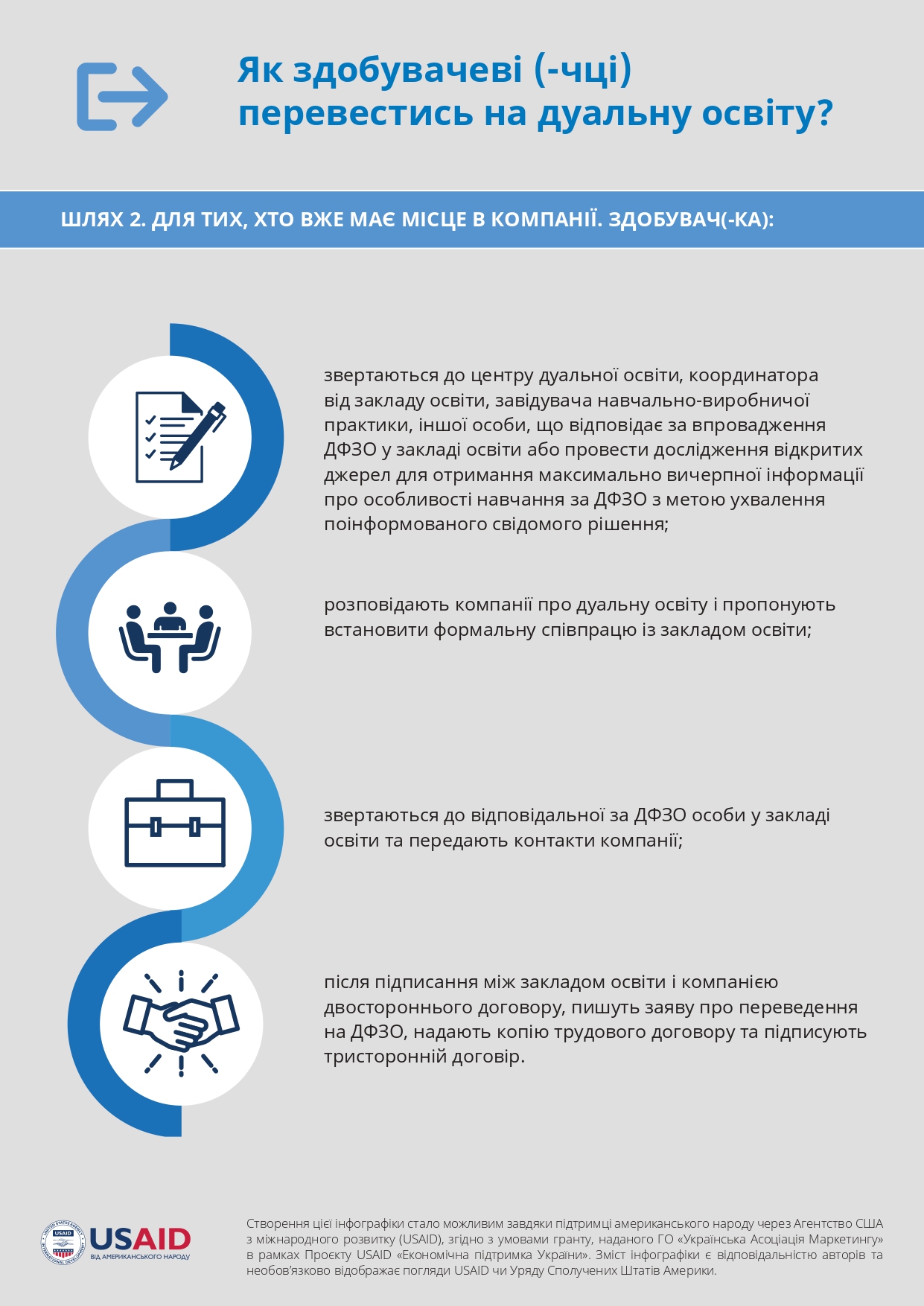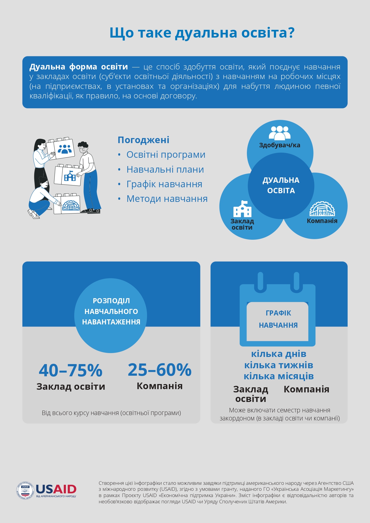 The report provides an analysis of the results of the third year of the experiment on the introduction of the dual form of education (DFZO) in institutions of professional pre-higher and higher education of Ukraine, describes approaches to the organization of cooperation with employers and their experience in training students of dual education, and also examines the experience of students of education, who went on to study under the DFZO. - Methodological recommendations for the implementation of a dual form of education / [Bugaychuk V., Buchynska O., Davlikanova O., Kovalchuk S., Leu-Severynenko S., Lylyk I., Perevozova I., Romanov M., Serik M., Chaikovska A.] ; in general ed. M. Romanov. – Kyiv: “Vistka” LLC, 2023. – 281 p.Methodological recommendations were developed with the aim of providing practical assistance to educational institutions, enterprises and students regarding the organization and implementation of a dual form of education. The methodical recommendations provide a sequence of actions for the implementation of a dual form of education, and based on the generalization of the current experience of Ukraine, instructions have been developed and templates of relevant documents have been provided.Methodological recommendations were issued within the framework of the project “Dual education for Ukraine”, which is implemented in partnership with the NGO “Ukrainian Marketing Association” and the USAID Project “Economic Support of Ukraine”.