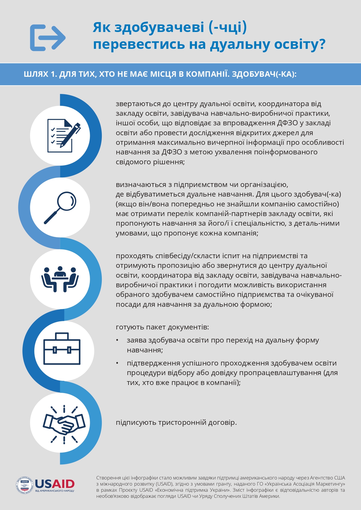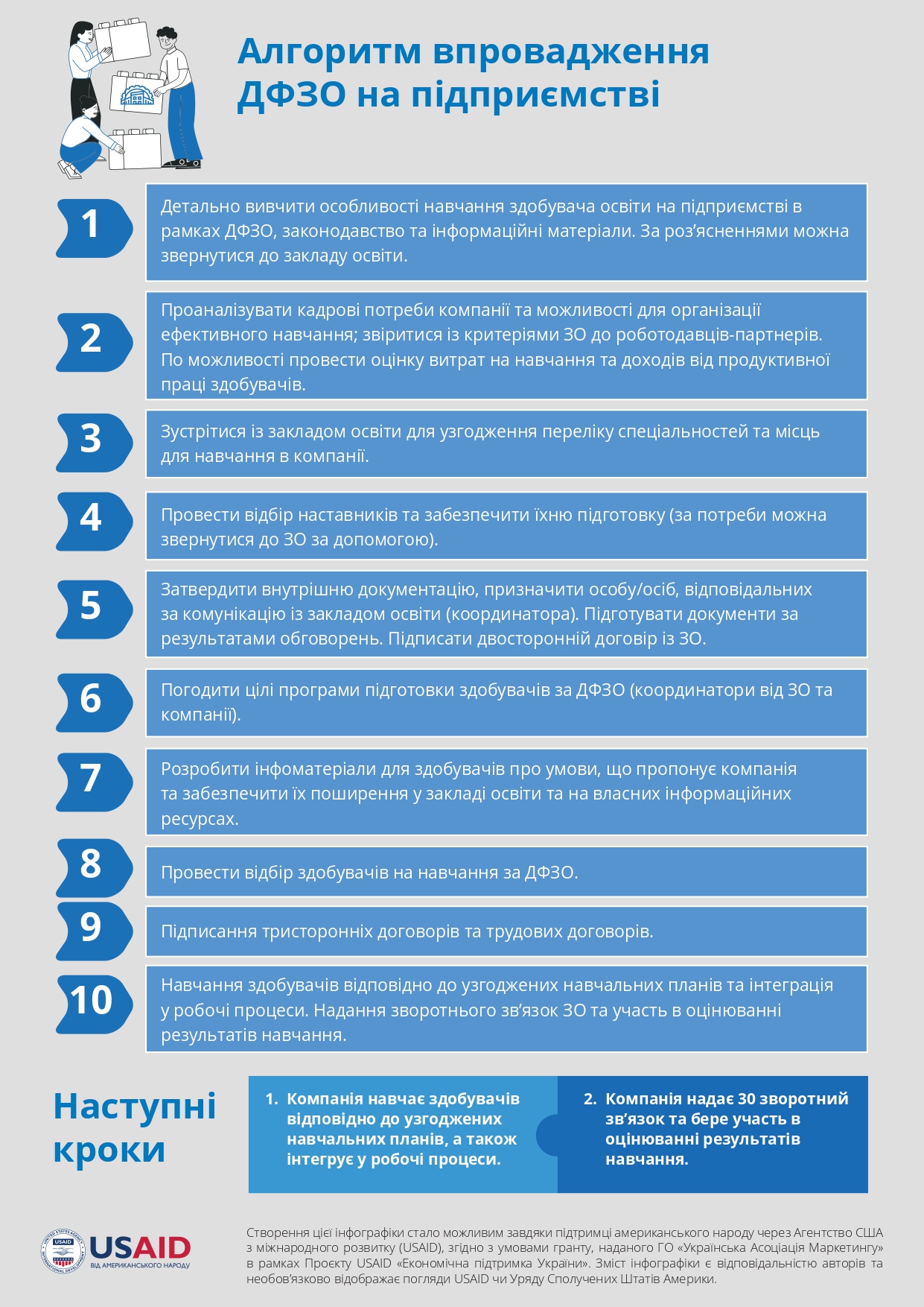 The toolkit is a step-by-step instruction on the implementation of a dual form of education (DFZO) for a participant in the process (e.g. educational institution, student or employer). The toolkit also contains links to the regulatory framework, document templates, and cases and practices of the implementation of the DFZO.