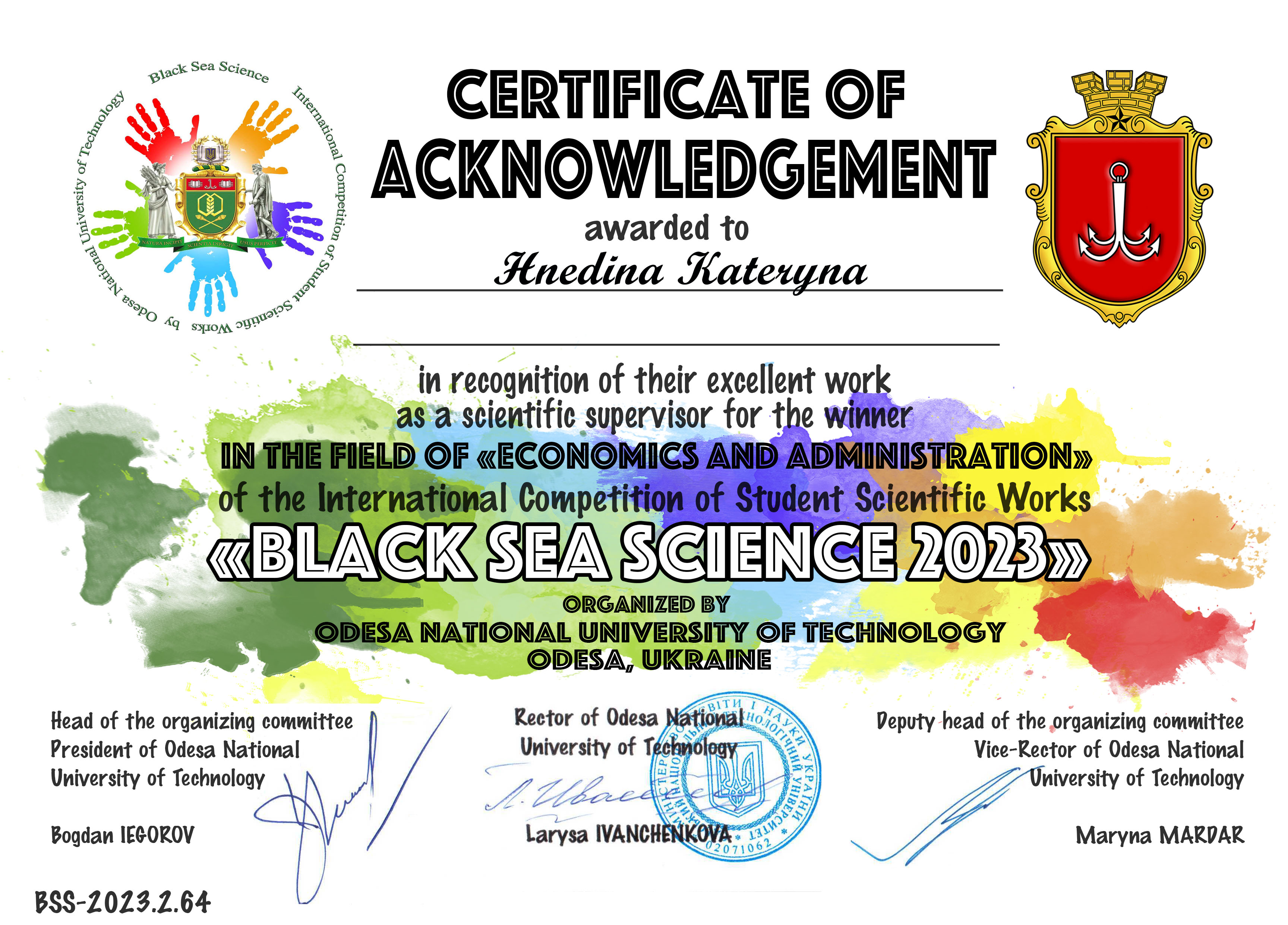 The scientific work on the topic “Hydropower industry of Ukraine: current state, prospects and fiscal instruments to stimulate development” was carried out under the supervision of the Doctor of Economics, associate professor, associate professor of the Department of Economics, Accounting and Taxation, head of the scientific club “Young Agents of Change” Hnedina Kateryna Volodymyrivna.