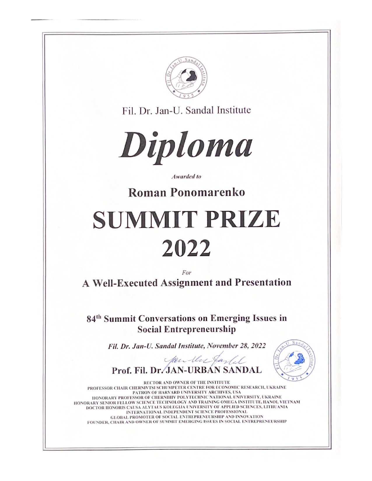Roman Ponomarenko, a graduate of the educational program “Business Marketing and Internet Communications”, who is currently undergoing a scientific internship at the Institute of Dr. Phil. Ya.-U. Sandala in Norway, received an honorary diploma and the award “Summit Prize 2022 – Well executed assignment and presentation” for a speech on the topic “The role of product positioning in ensuring effective marketing activities of the enterprise”.