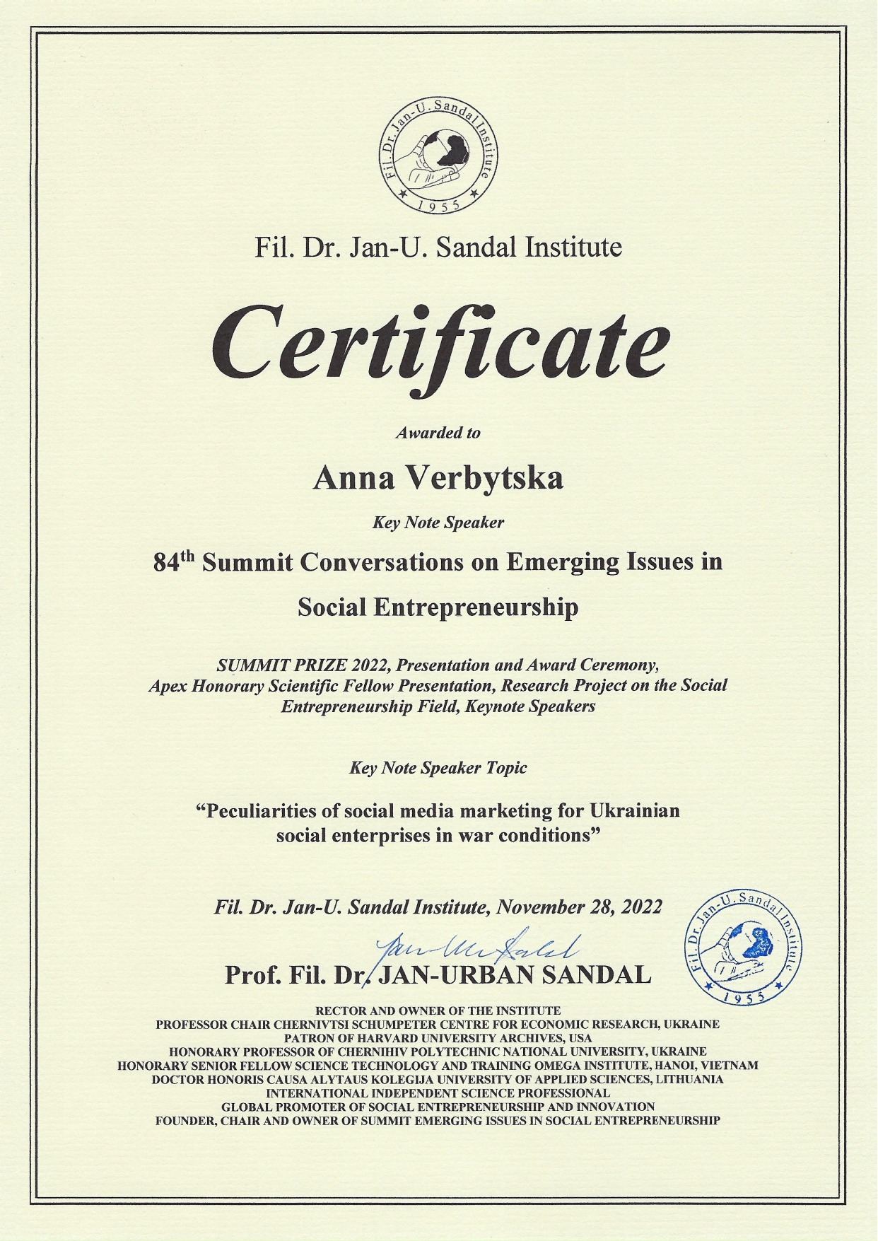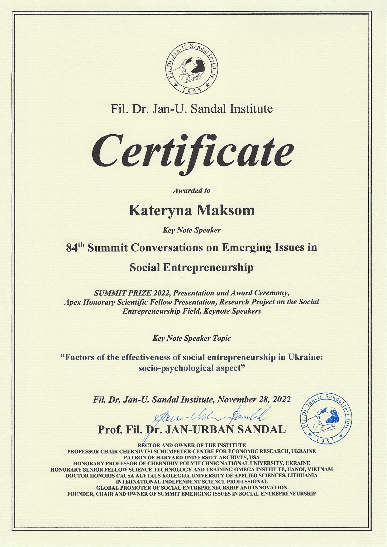 On November 25, 2022, the 84th International Summit on Social Entrepreneurship was held, organized by the University’s partner – the Institute of Dr. Phil. Ya.-U. Sandal in Norway.