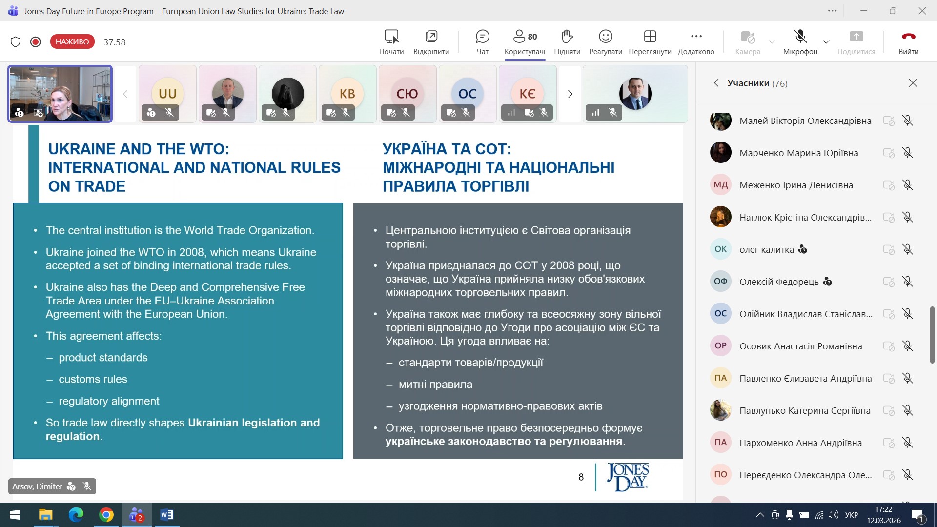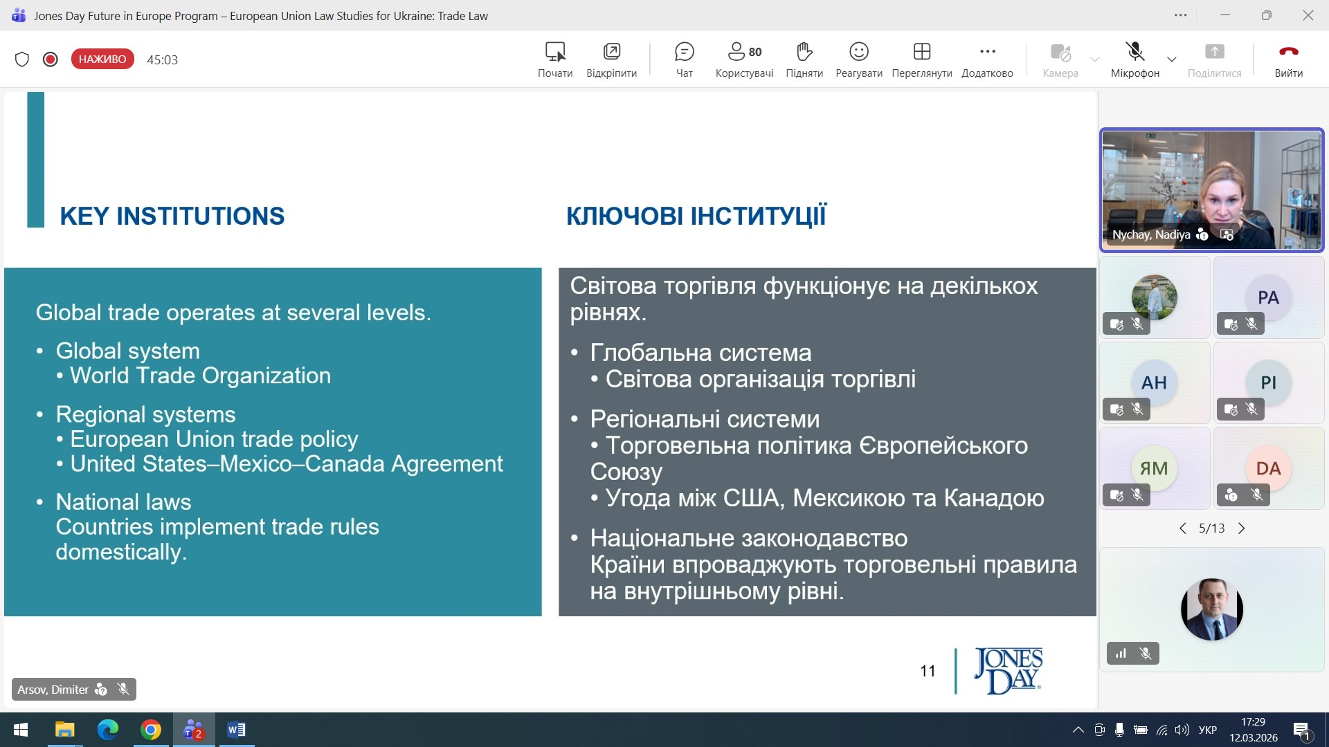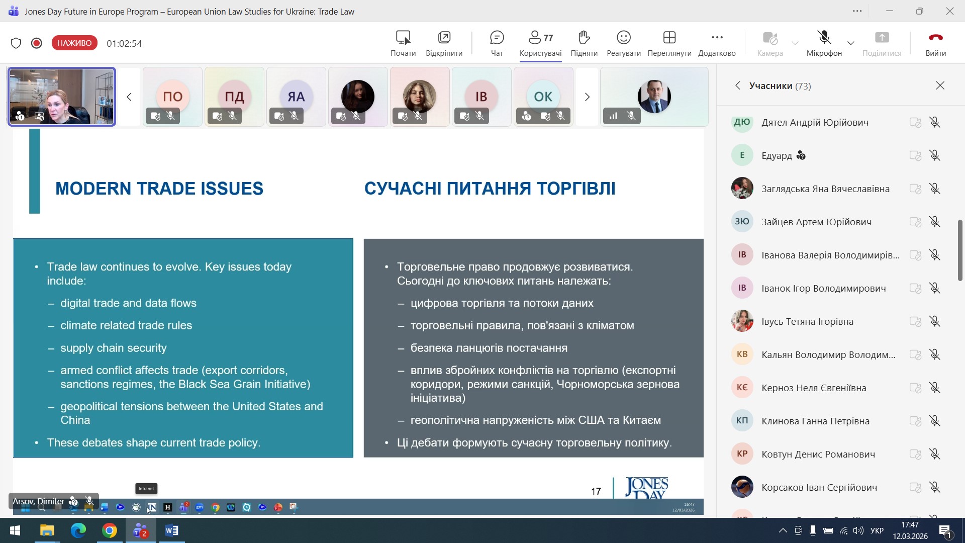 On 12 March 2026, a guest online lecture was held for law students, focusing on current issues in international and European trade law. The event featured a guest speaker, Nadiya Nychay – a representative of the international law firm Jones Day – as part of the “Future of Europe Programme – European Union Law Studies for Ukraine”.
