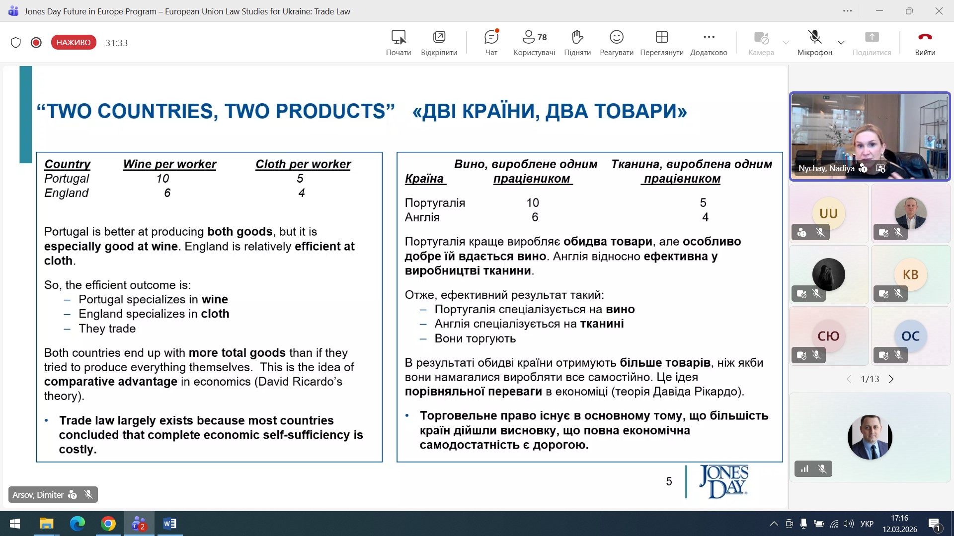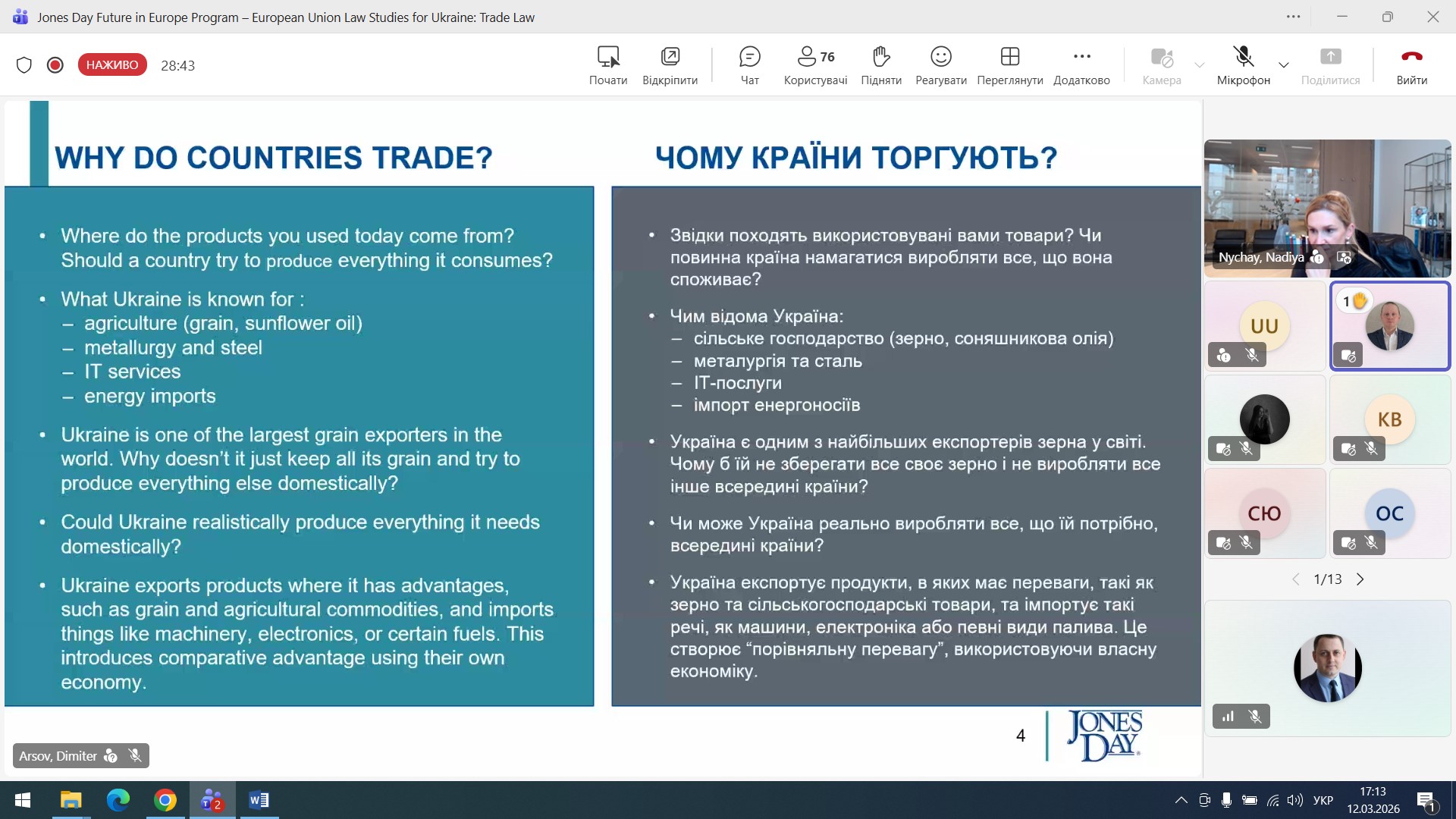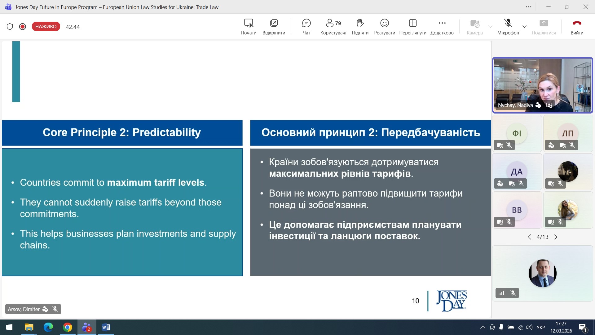 On 12 March 2026, a guest online lecture was held for law students, focusing on current issues in international and European trade law. The event featured a guest speaker, Nadiya Nychay – a representative of the international law firm Jones Day – as part of the “Future of Europe Programme – European Union Law Studies for Ukraine”.