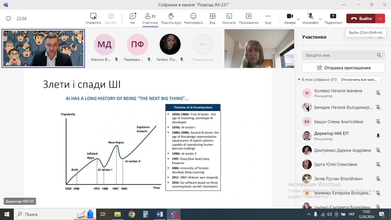 On March 12, 2024, the first lecture was held as part of the course “Artificial Intelligence in EU Financial Institutions”, taught within the framework of the AIFEU project under the ERASMUS+ Jean Monnet Module program. In the current year, the course is taught for two groups of higher education applicants of different levels and areas of training at Chernihiv Polytechnic University.
