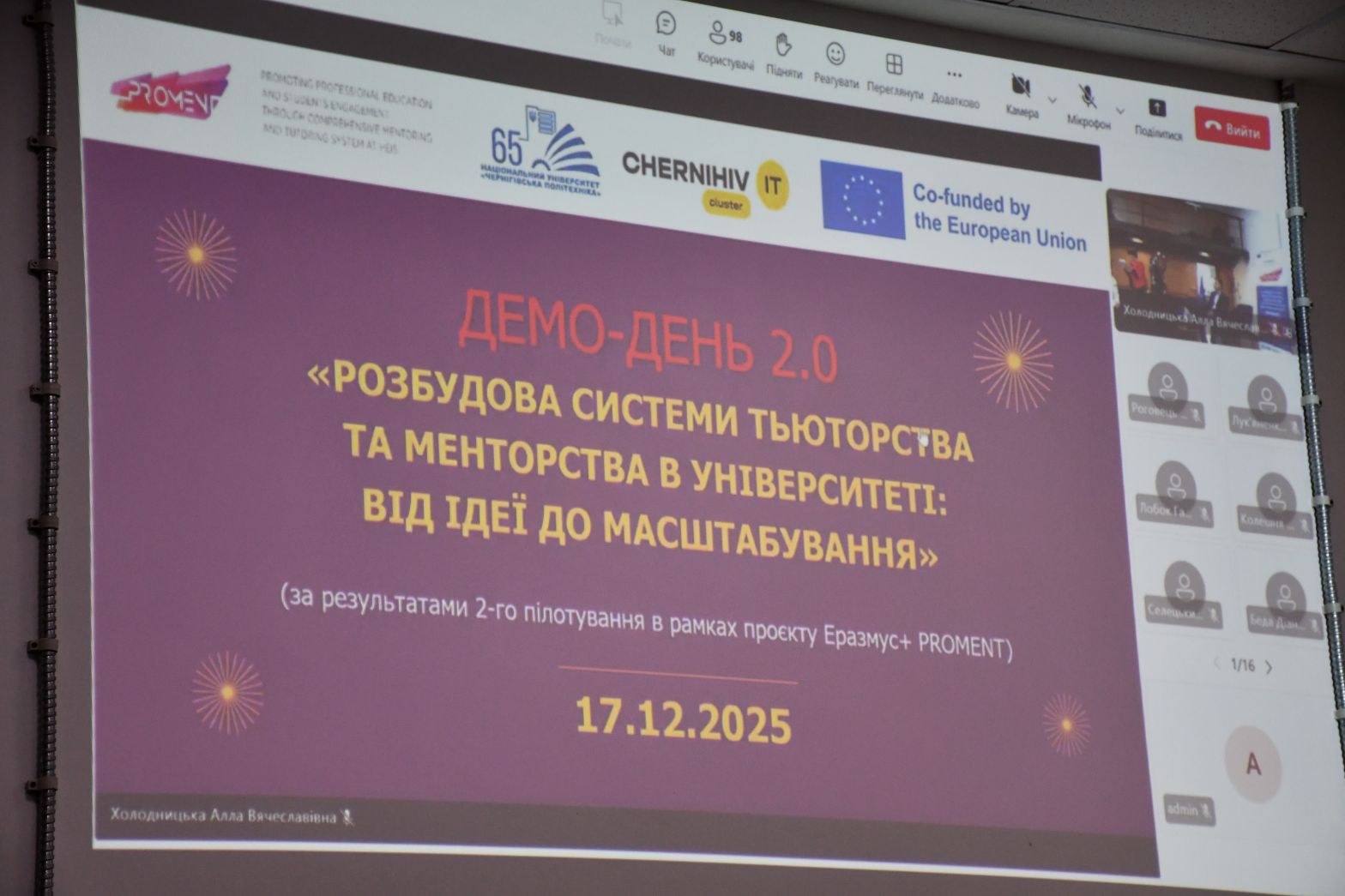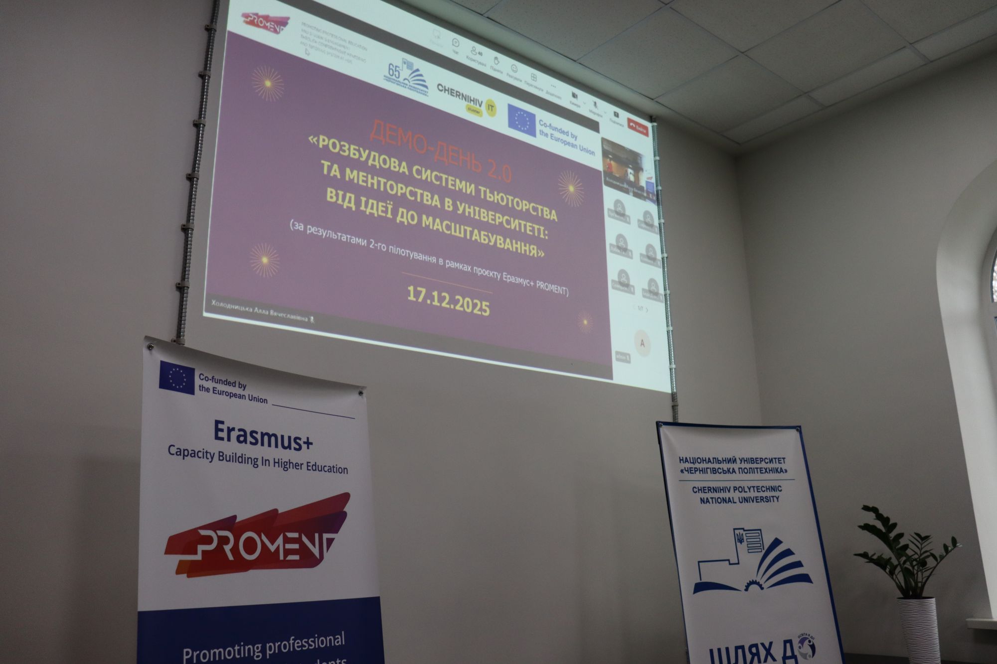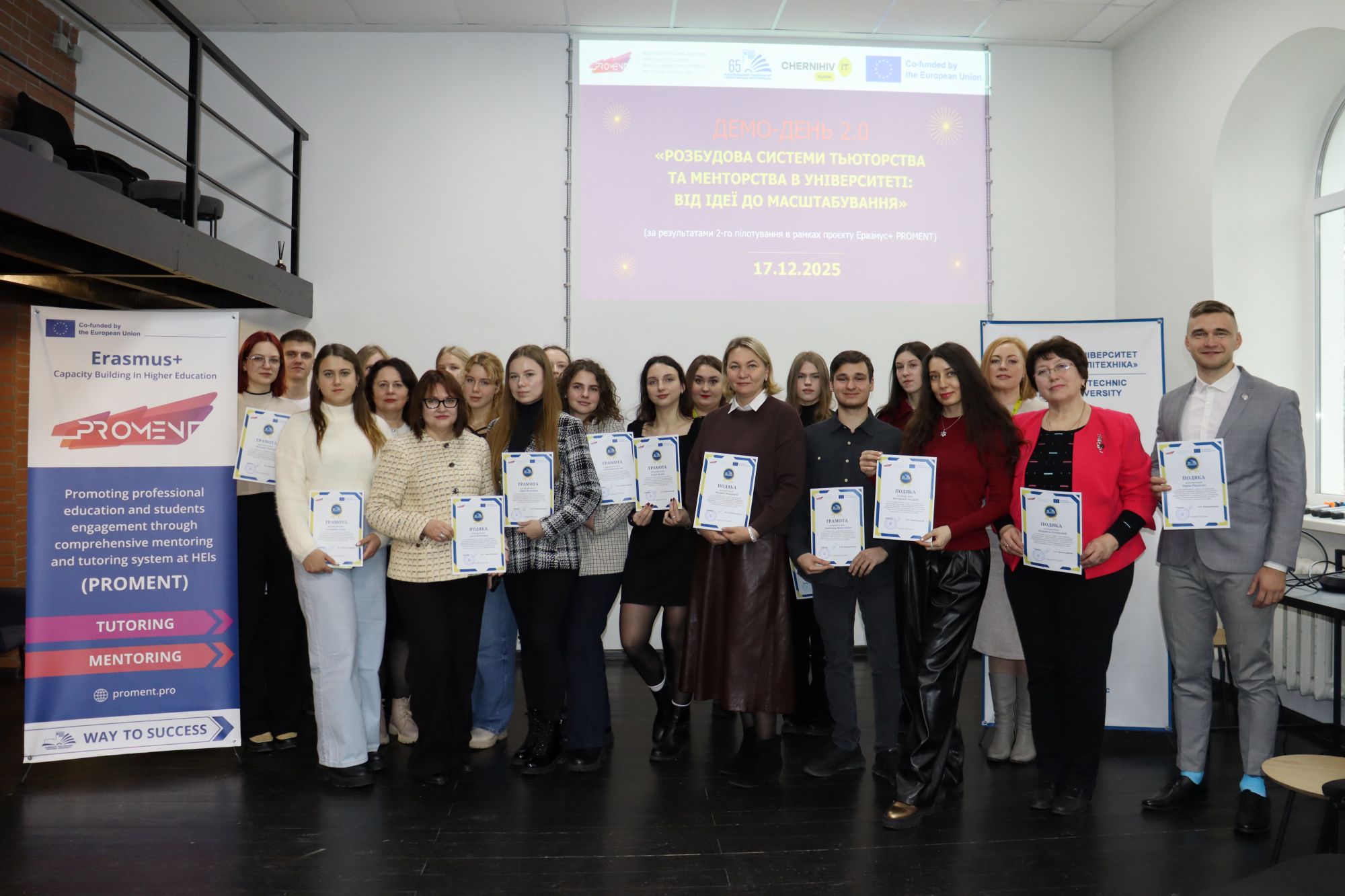On 17 December 2025, Demo Day 2.0 took place in a mixed format at the Chernihiv Polytechnic National University. “Developing a tutoring and mentoring system at the university: from idea to scaling up”, dedicated to the results of the second pilot within the Erasmus+ PROMENT project (Project: 101082696). The aim of Demo Day was to promote the initiatives of the PROMENT project and demonstrate the practical value of tutoring and mentoring for the development of soft skills and professional competencies among students.