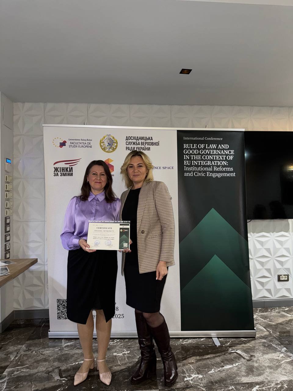 From 5 to 11 November 2025, Oksana Myronets, Associate Professor of the Department of Law Enforcement and General Legal Disciplines of the Faculty of Law at Chernihiv Polytechnic National University, completed an international internship and, as a member of the programme and organisational committee, moderated an international conference as part of the internship (“Rule of law and good governance in the context of EU integration: institutional reforms and civic engagement”) for specialists in the field of law, management, education and the public sector at Babeș-Bolyai University in Cluj-Napoca (Romania).
