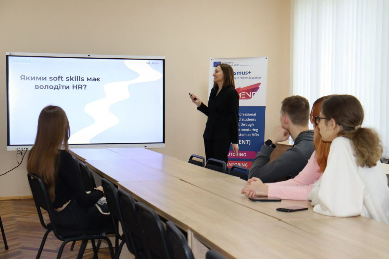On May 16, a meeting was held at the Tutoring and Mentoring Center in a mixed format with the mentor of the educational project ‘Professional Mentoring: First Steps to a Career’ – Oksana Voityshyna (HR Manager at the company JEVERA).