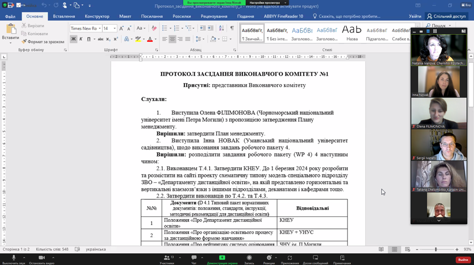 At the beginning of the meeting of the Executive Committee, O. Filimonova made a proposal to approve the Project Management Plan. (Petro Mohyla Black Sea National University).