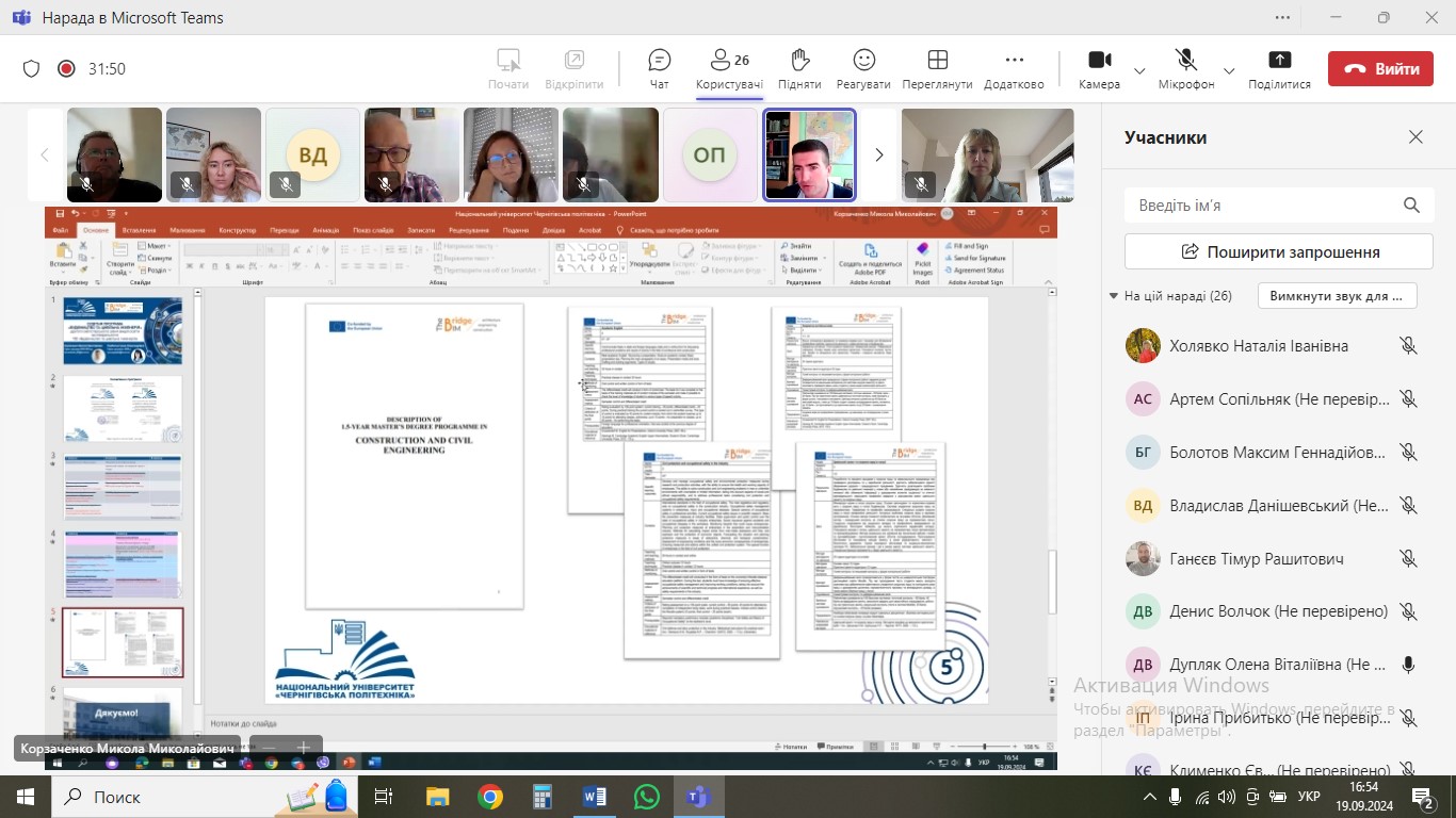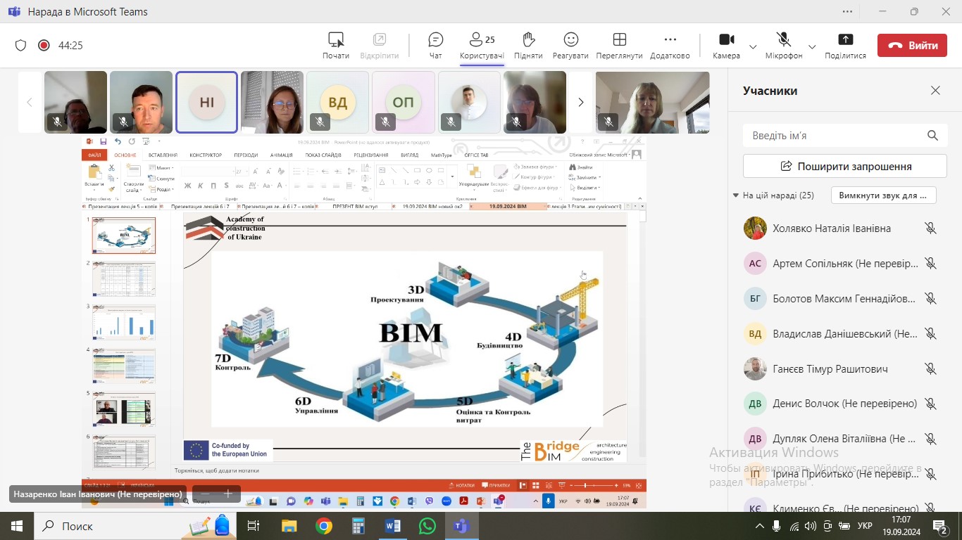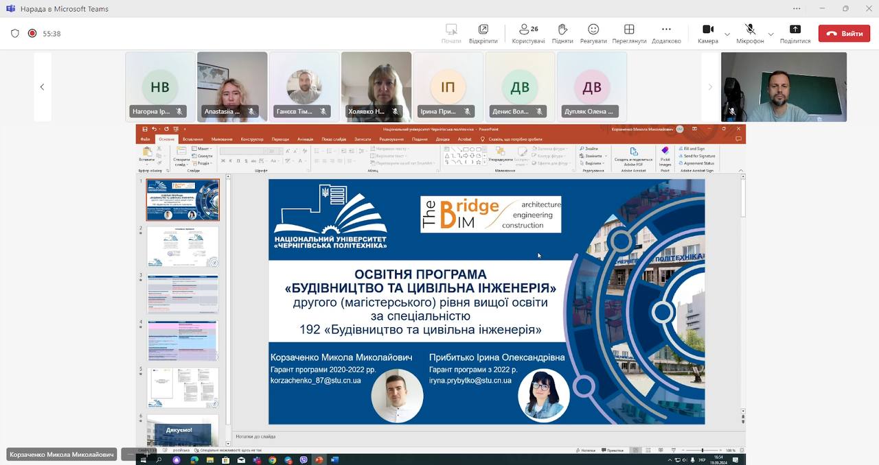 On September 19, 2024, representatives of the Chernihiv Polytechnic National University took part in the online coordination meeting of the consortium of the international project The BRIDGE “Bridging the gap between university and industry: Master Curricular Supporting the Development of Green Jobs and Digital Skills in the Ukrainian Building Sector”. The project is being implemented under the EU Erasmus+ KA2 programme and aims to create Master’s degree programmes using BIM-technologies in architecture, engineering and construction at Ukrainian higher education institutions.