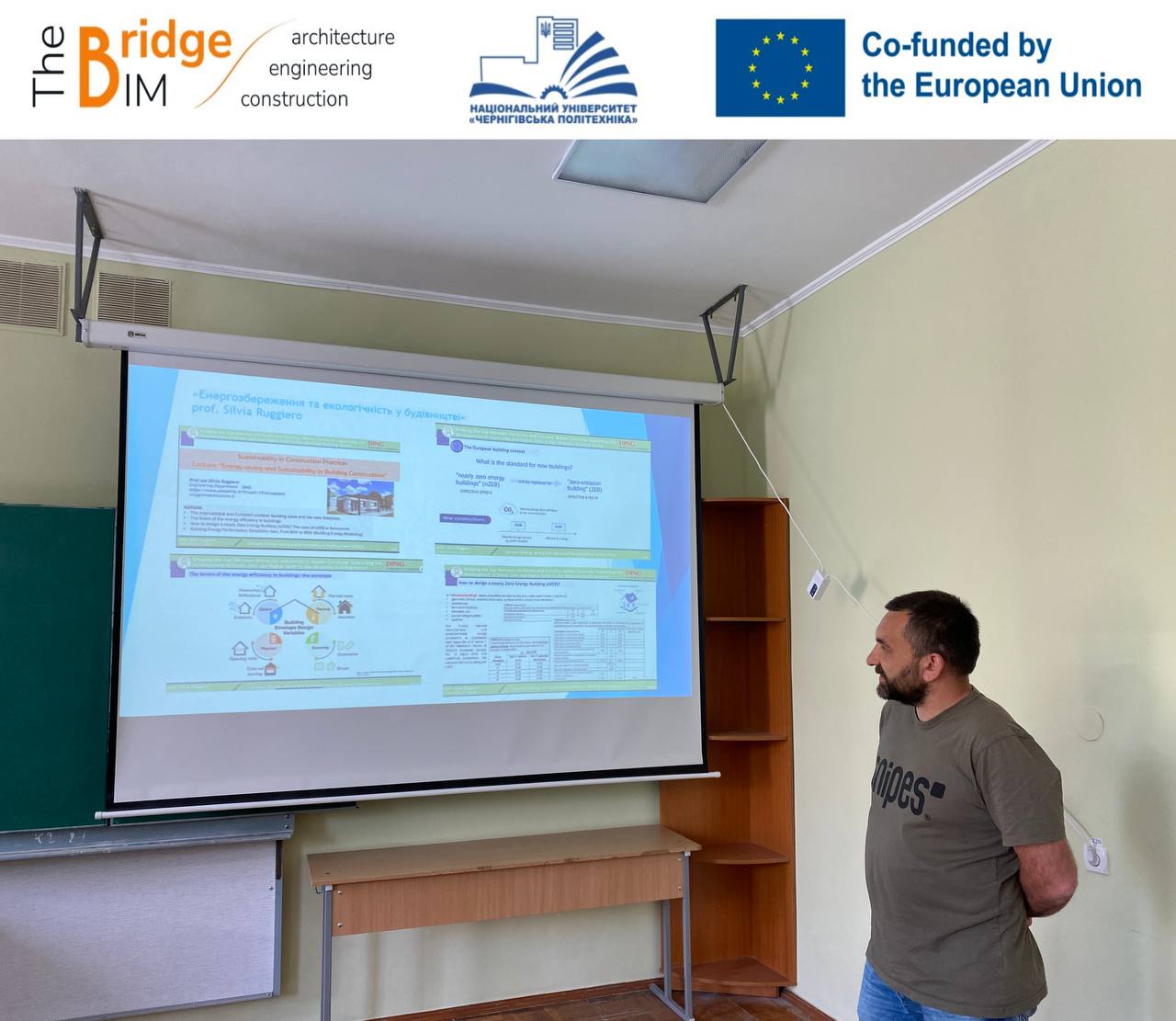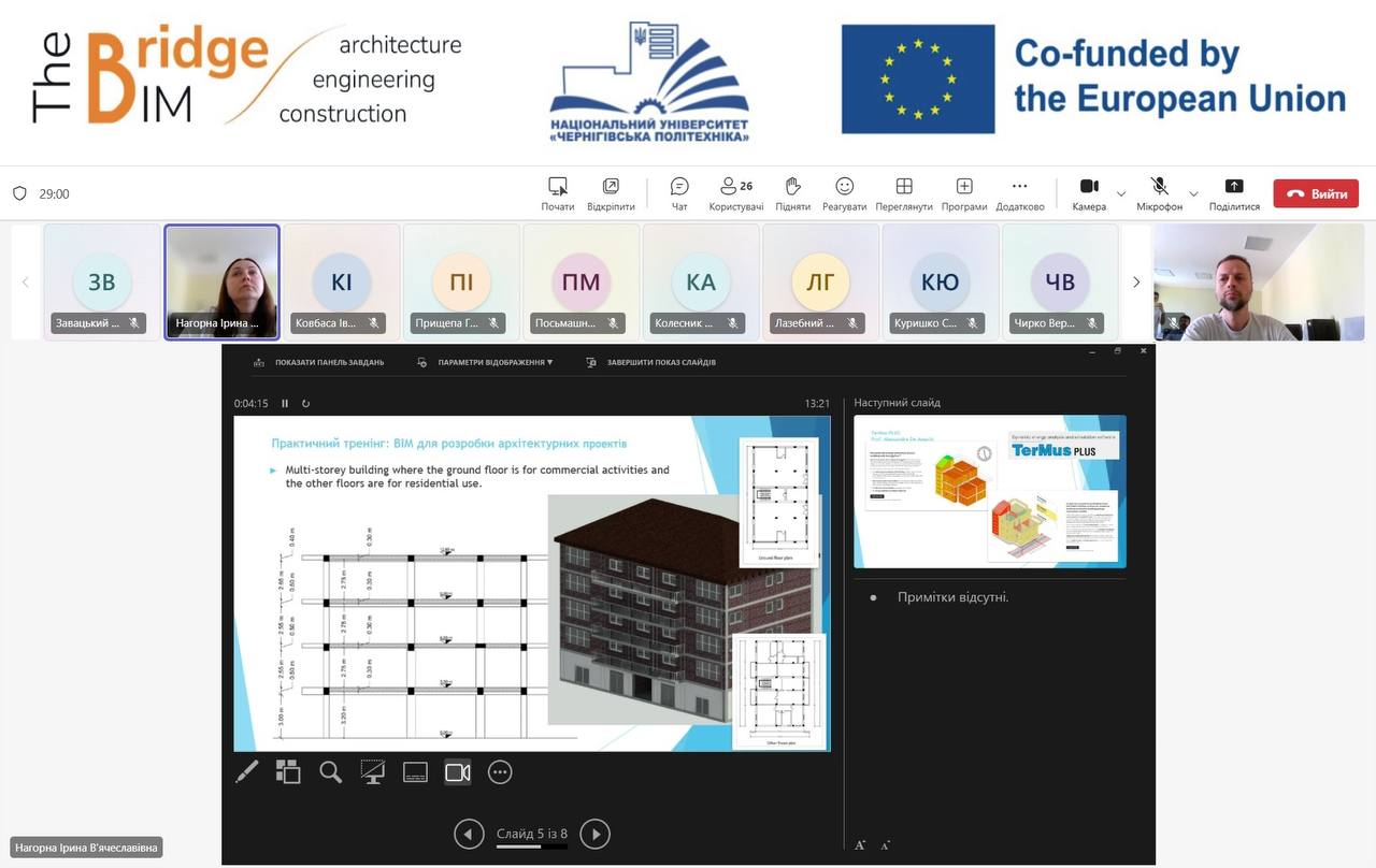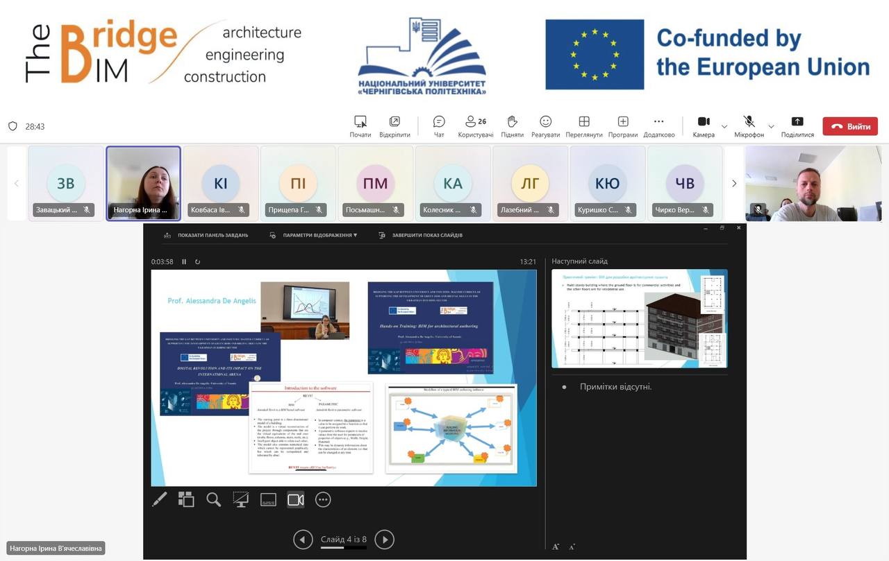 On 24 April 2024, a meeting of teachers and students of the Department of Welding and Construction Technologies and the Department of Architecture and Environment Design of the Chernihiv Polytechnic National University was held in a mixed format. During the event, the results of the academic mobility of teachers to UNISANNIO university (Benevento, Italy) within the framework of The BRIDGE project ‘Bridging the gap between university and industry: Master Curricular Supporting the Development of Green Jobs and Digital Skills in the Ukrainian Building Sector’, implemented under the Erasmus+ KA2 programme, were discussed.