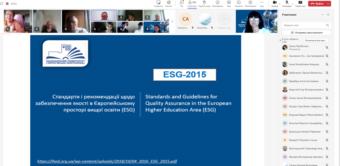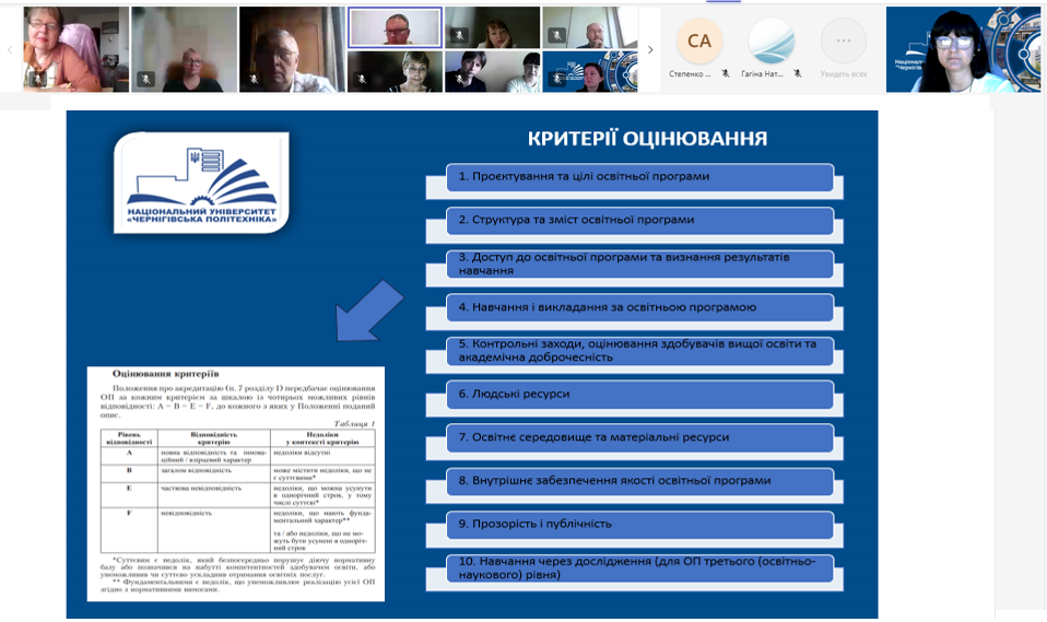 The speakers of the meeting were Iryna Prybytko, PhD, Associate Professor, Head of the Higher Education Quality Management Systems Sector and Serhii Tsybulia, PhD, Professor, expert of the National Agency for Higher Education Quality Assurance, Director of the Educational and Research Institute of Mechanical Engineering, Technology and Transport.