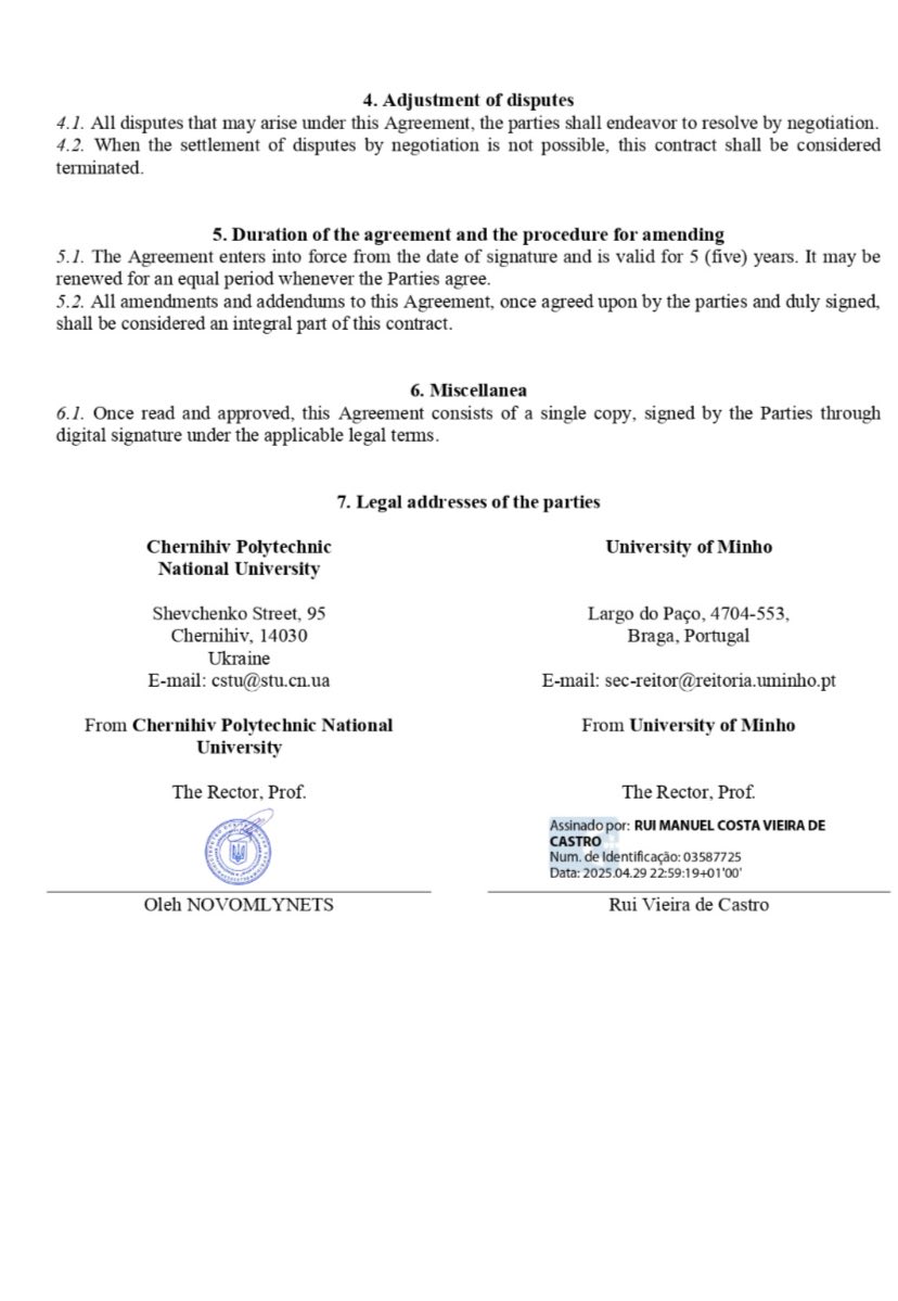 The relevant document was signed on 29 April 2025 by the Rector of the Chernihiv Polytechnic National University, Professor Oleh Novomlynets and the Rector of the University of Minho, Professor Rui Vieira de Castro.