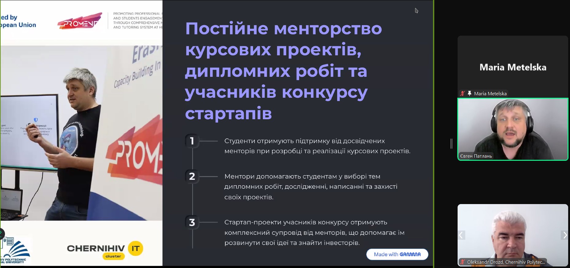 On 13 May 2025, the Mentors’ Training within the international Erasmus+ project KA2 PROMENT, organised by the Chernihiv Polytechnic National University together with the Chernihiv IT Cluster and the Charitable Foundation “Rokada”, took place online.