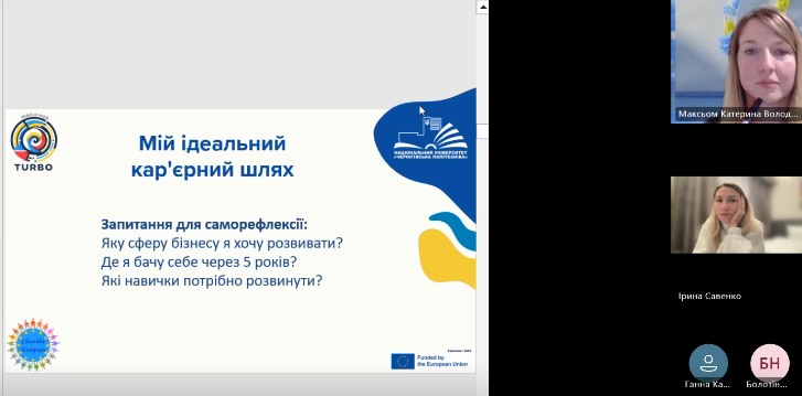 On March 27, within the course “Psychology of Business” (delivered as part of the microcredit educational program), a training session on “Business Career Development” was conducted by Kateryna Maksom, PhD in Psychology, Associate Professor, Head of the Department of Social Work, Project Coordinator from CPNU.