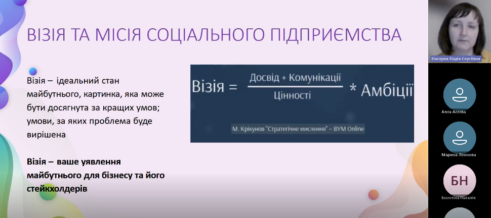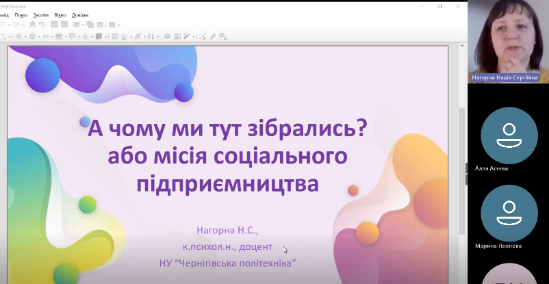 On April 3, as part of the module “Social Entrepreneurship,” a training session “Value Foundations of Social Entrepreneurship” was held, led by Nadiia Nahorna, PhD in Psychology, Associate Professor, Dean of the Faculty of Social Technologies, Health and Rehabilitation.