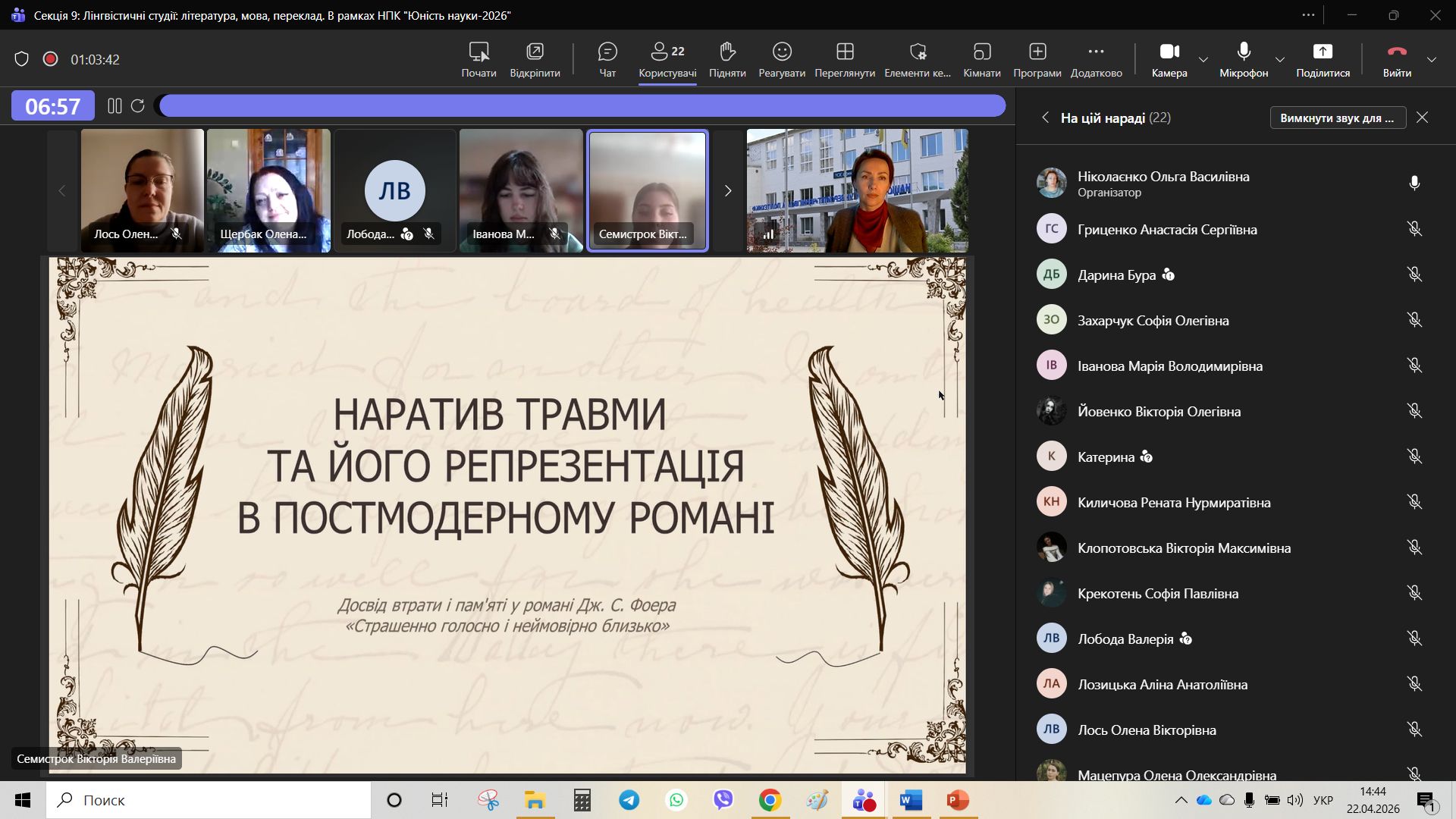 the work of the ninth section was characterized by its broad geographic reach and a sense of continuity between generations. In addition to Philology students from Chernihiv Polytechnic National University, the discussion included fourth-year students from T.H. Shevchenko National University “Chernihiv Colehium” and a 10th-grade student from the Chernihiv Regional Scientific Lyceum. This format not only strengthens cooperation between institutions but also creates a strong career-orientation path for school students.