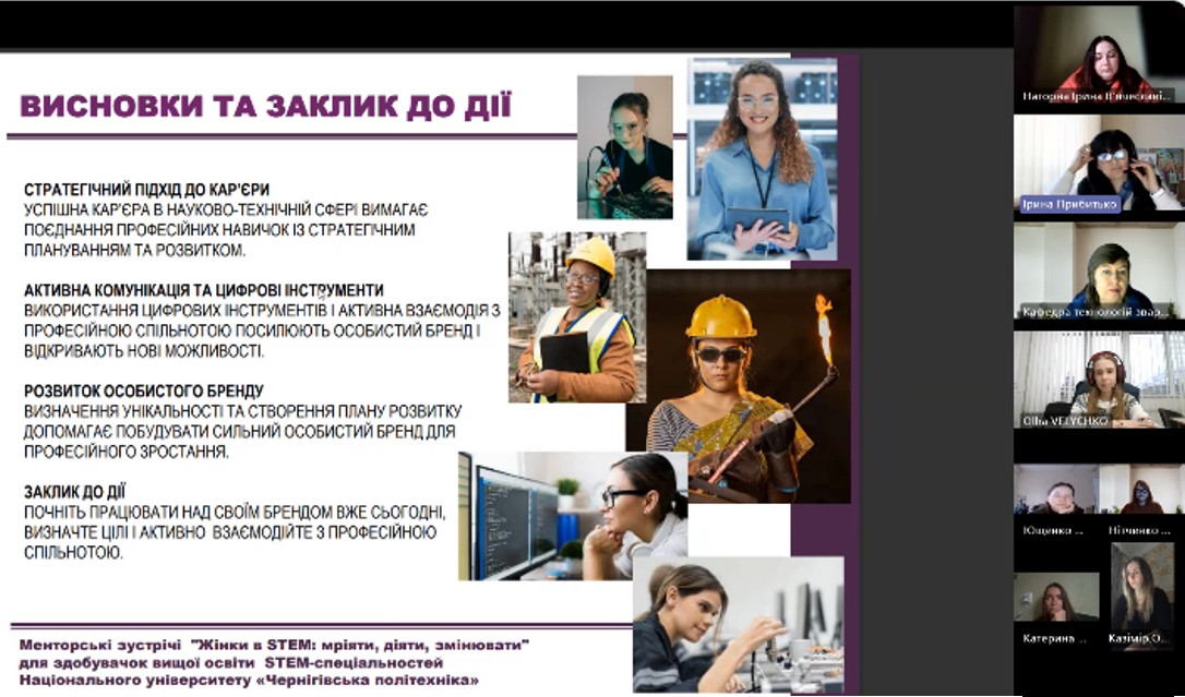 The mentor of the session, Iryna Prybytko, Director of the Educational-Scientific Institute of Engineering, Manufacturing and Construction at Chernihiv Polytechnic National University, shared her own professional path, talked about how to build a career trajectory in science and technology and beyond, where to start when forming a personal brand, and what decisions help to gradually move towards leadership positions.