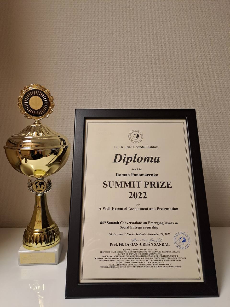 Здобувач вищої освіти освітньої програми «Бізнес-маркетинг та інтернет-комунікації» Роман Пономаренко, який наразі проходить наукове стажування в Інституті д-ра філ. Я.-У. Сандала у Норвегії, отримав почесний диплом та відзнаку «Summit Prize 2022 – Well executed assignment and presentation» за виступ на тему “The role of product positioning in ensuring effective marketing activities of the enterprise“.