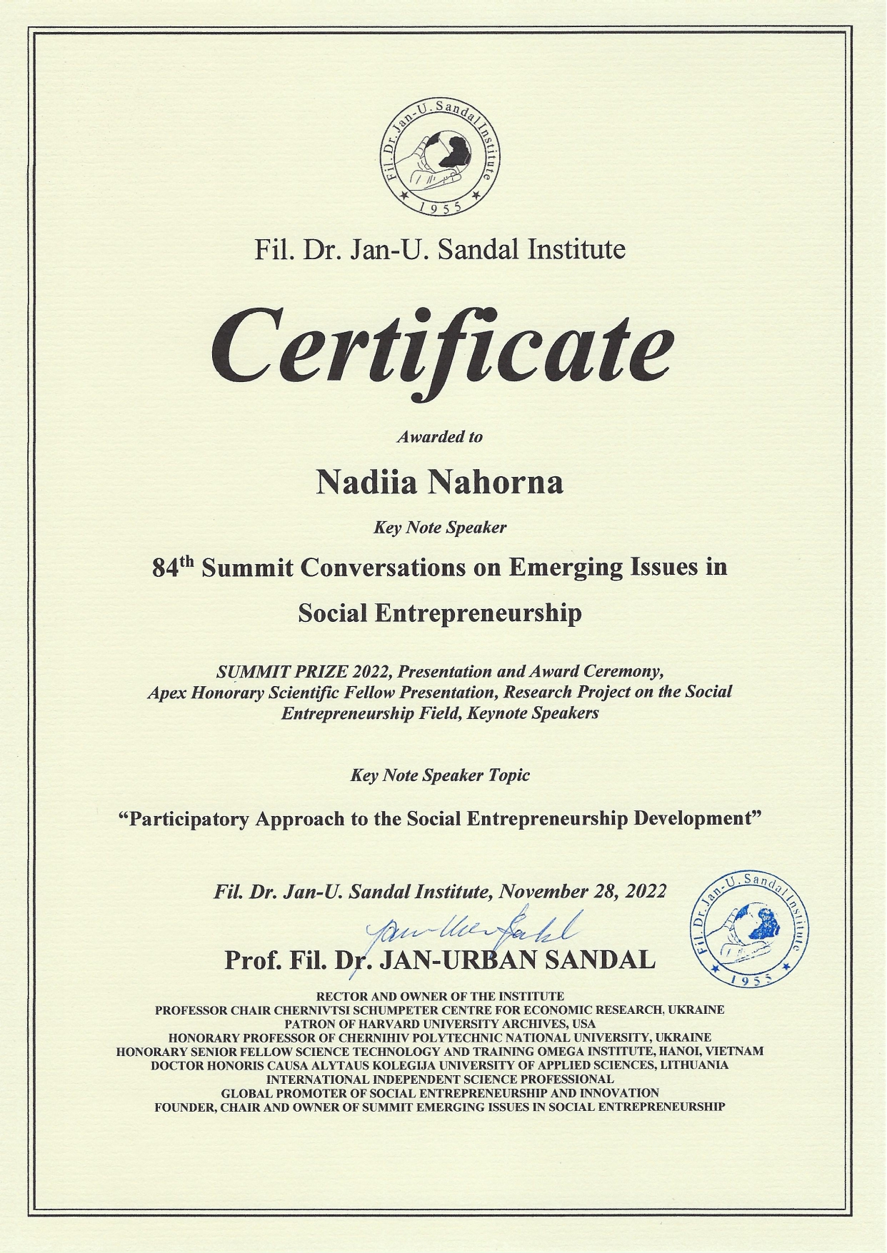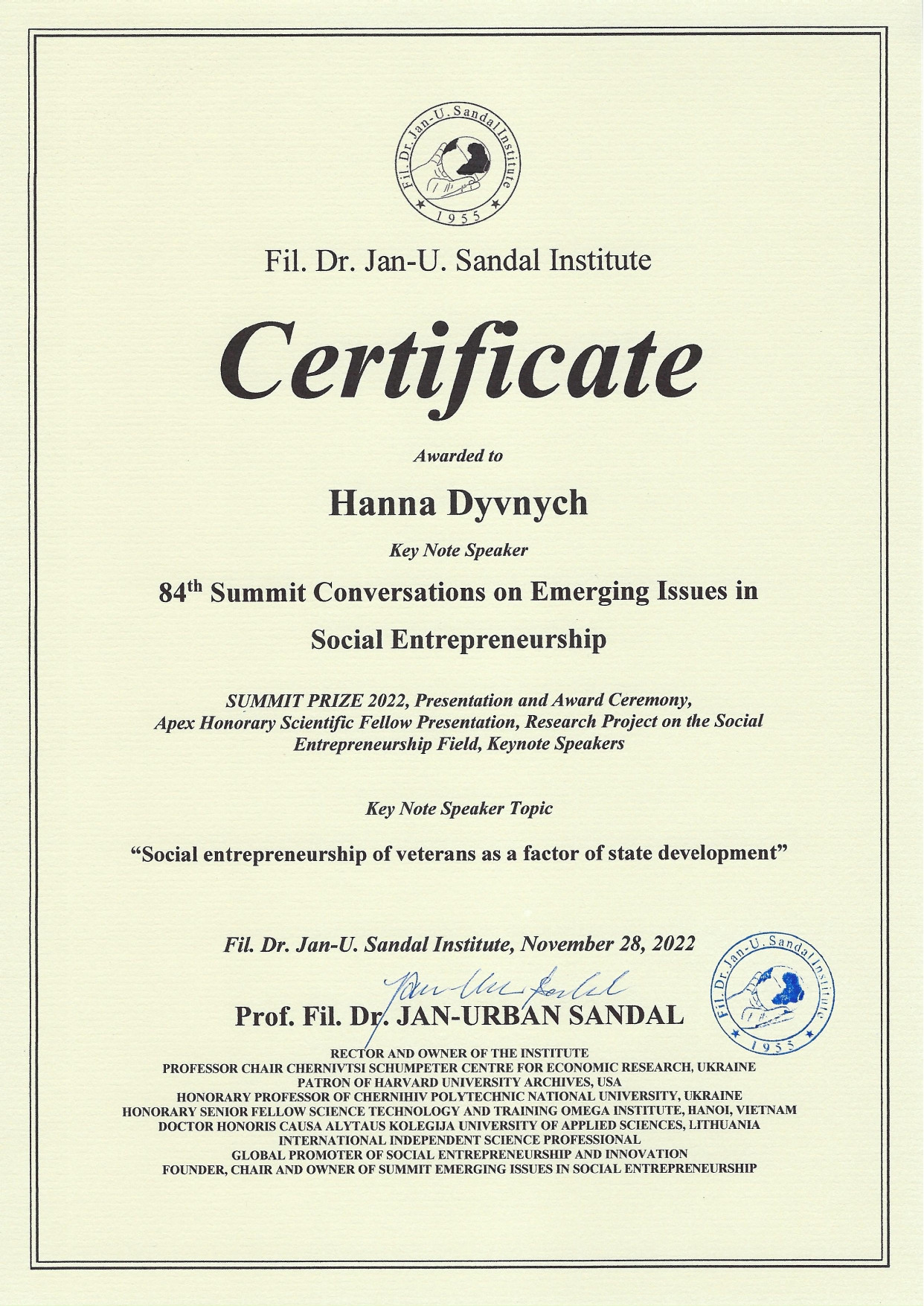 25 листопада 2022 року відбувся 84-й Міжнародний Саміт з соціального підприємництва, організований партнером Університету – Інститутом д-ра філ. Я.-У. Сандала у Норвегії.