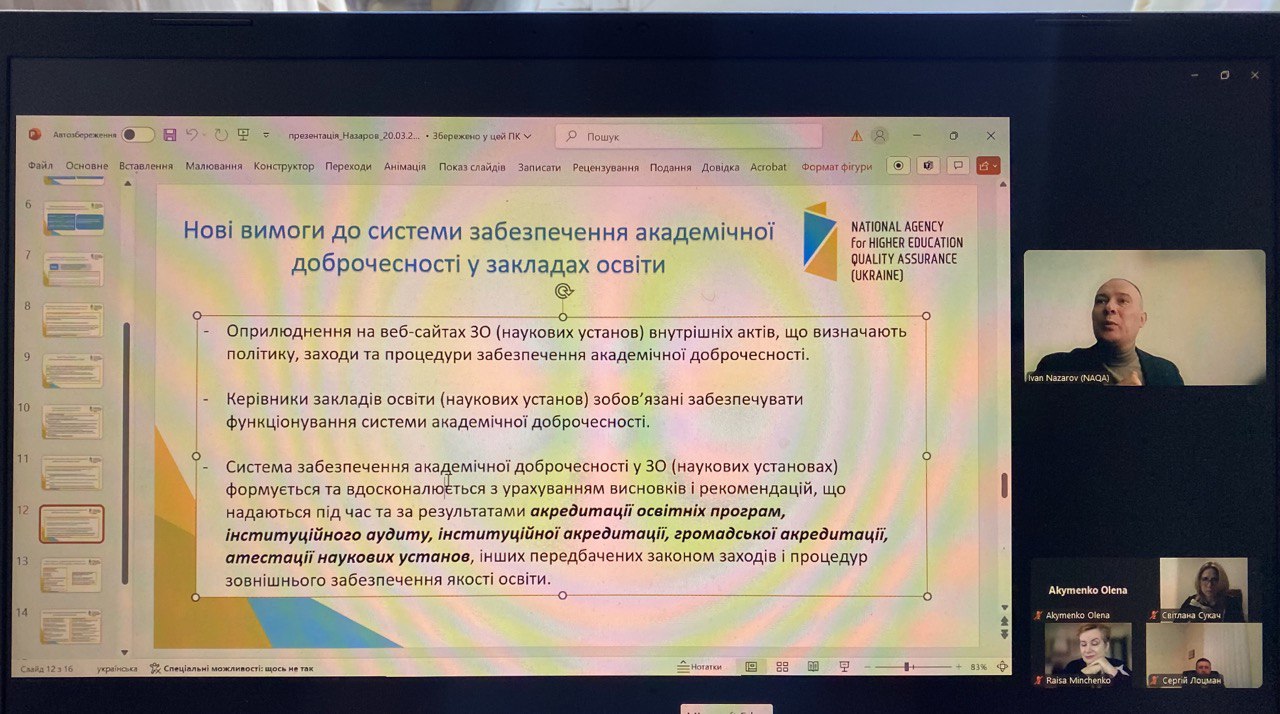 Вебінар мав на меті підвищення обізнаності учасників щодо проблем забезпечення академічної доброчесності, ознайомлення з перспективами розвитку національного законодавства України у цій сфері, а також обговорення сучасних викликів і можливостей на перетині академічної доброчесності та розвитку штучного інтелекту.
