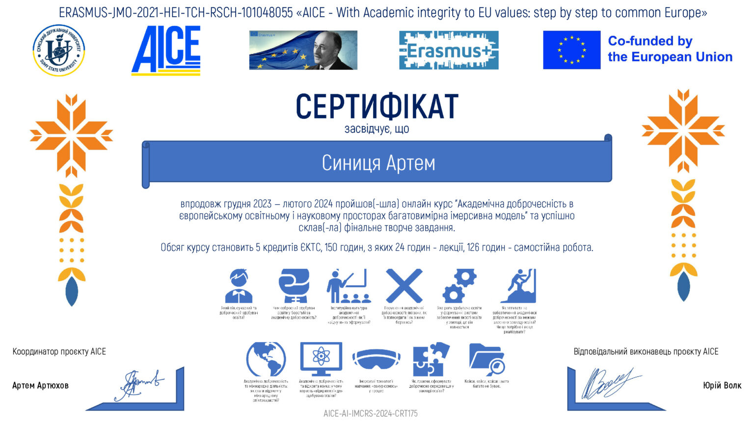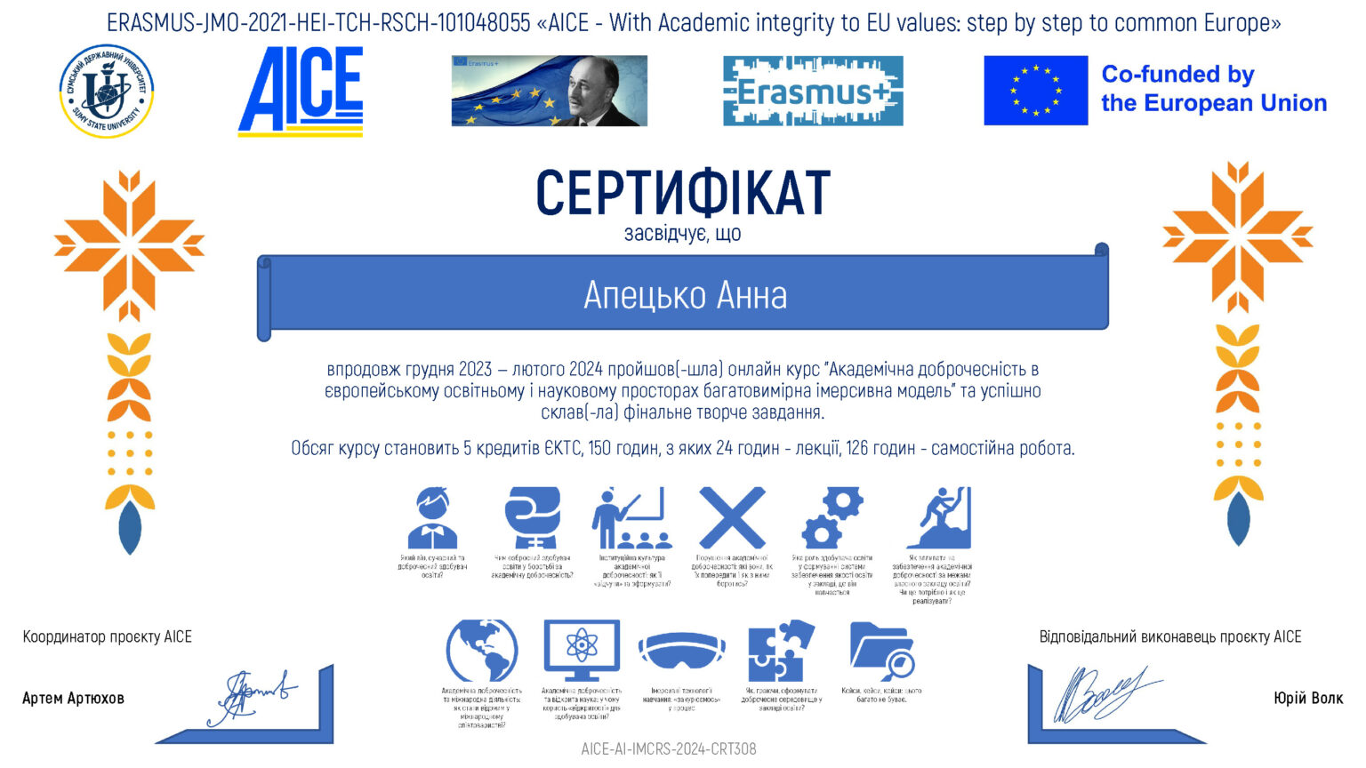 Викладачі кафедри фізичної реабілітації НУ «Чернігівська політехніка» Синиця Артем Олексійович та Апецько Анна Михайлівна успішно пройшли курс «Академічна доброчесність в європейському освітньому і науковому просторах: багатовимірна імерсивна модель» впродовж грудня 2023 — лютого 2024. Обсяг курсу становить 5 кредитів ЄКТС, 150 годин, з яких 24 годин – лекції, 126 годин – самостійна робота.