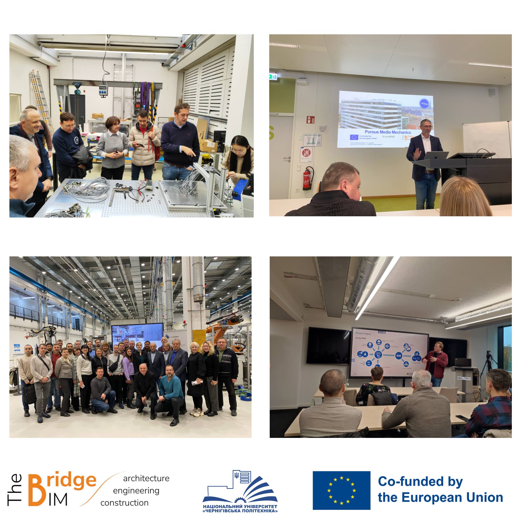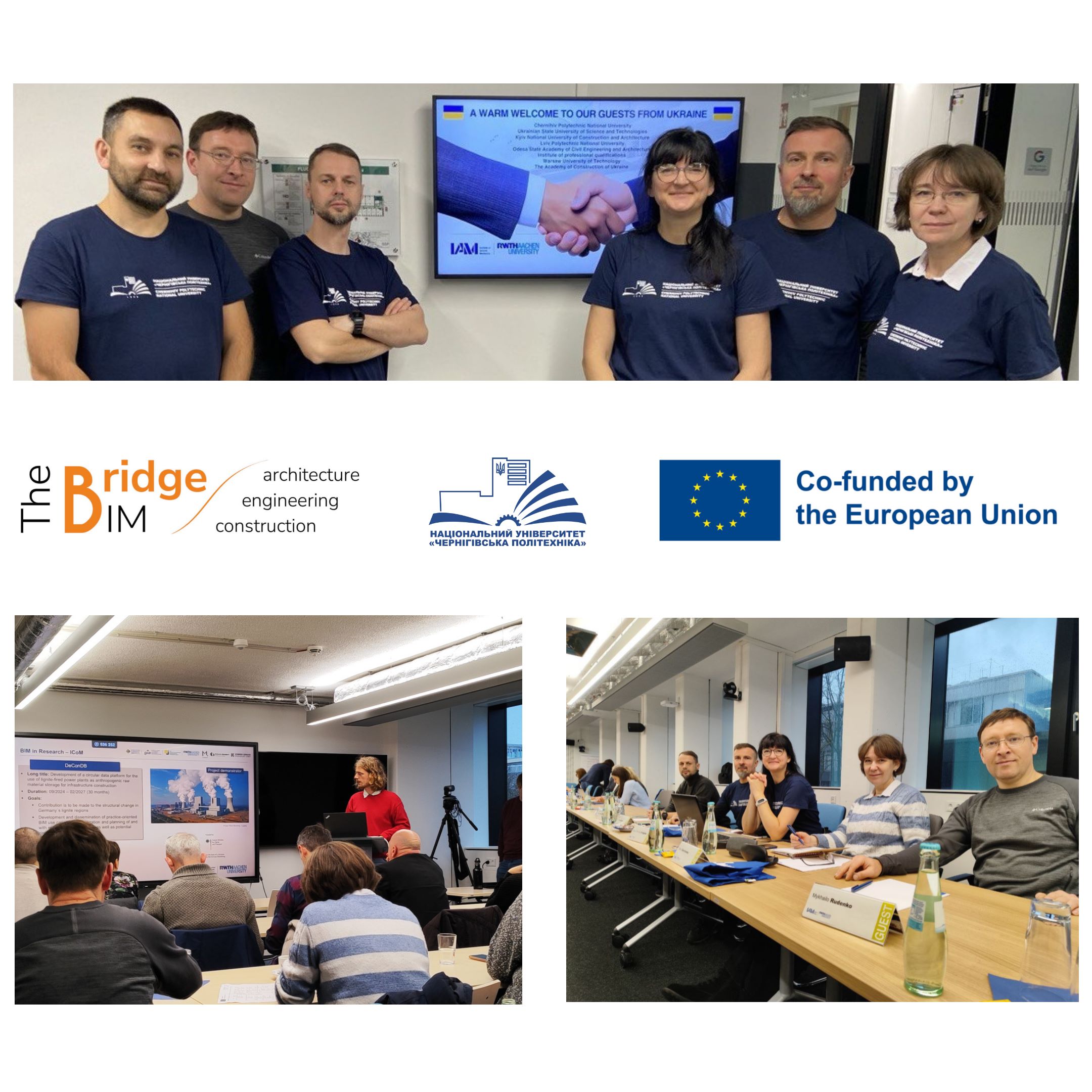У рамках академічної мобільності команда Чернігівської політехніки: ознайомилася з магістерськими програмами з ВІМ-технологій, зокрема, з міждисциплінарним курсом – Master course “Resilient Civil Engineering”; відвідала лабораторії університету (Mechanics I Exercise; IAM Labs and Workshops; WZL Laboratory for Machine Tools and Production Engineering; Virtual Lab and aixCAVE); взяла участь у майстер-класах із застосування ВІМ-орієнтованого програмного забезпечення (Siemens NX; FlexPDE тощо).