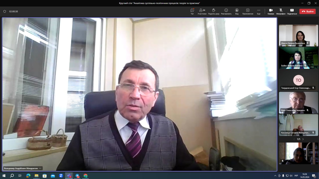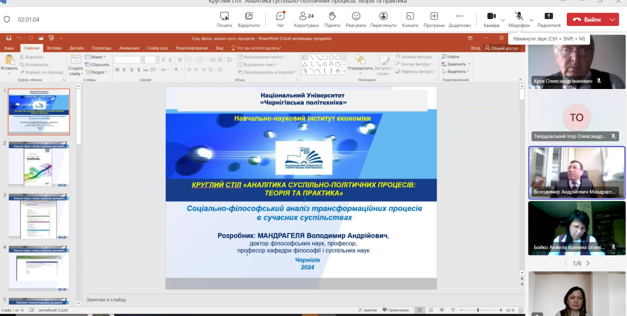 З нагоди Тижня науки в НУ «Чернігівська політехніка» колектив кафедри філософії і суспільних наук та дирекція Навчально-наукового інституту економіки 14 травня 2024 р. провели круглий стіл «АНАЛІТИКА СУСПІЛЬНО-ПОЛІТИЧНИХ ПРОЦЕСІВ: ТЕОРІЯ ТА ПРАКТИКА». Захід, проведений в онлайн форматі, об’єднав близько 30 учасників, серед них – відомі науковці України, науково-педагогічні працівники, здобувачі вищої освіти.