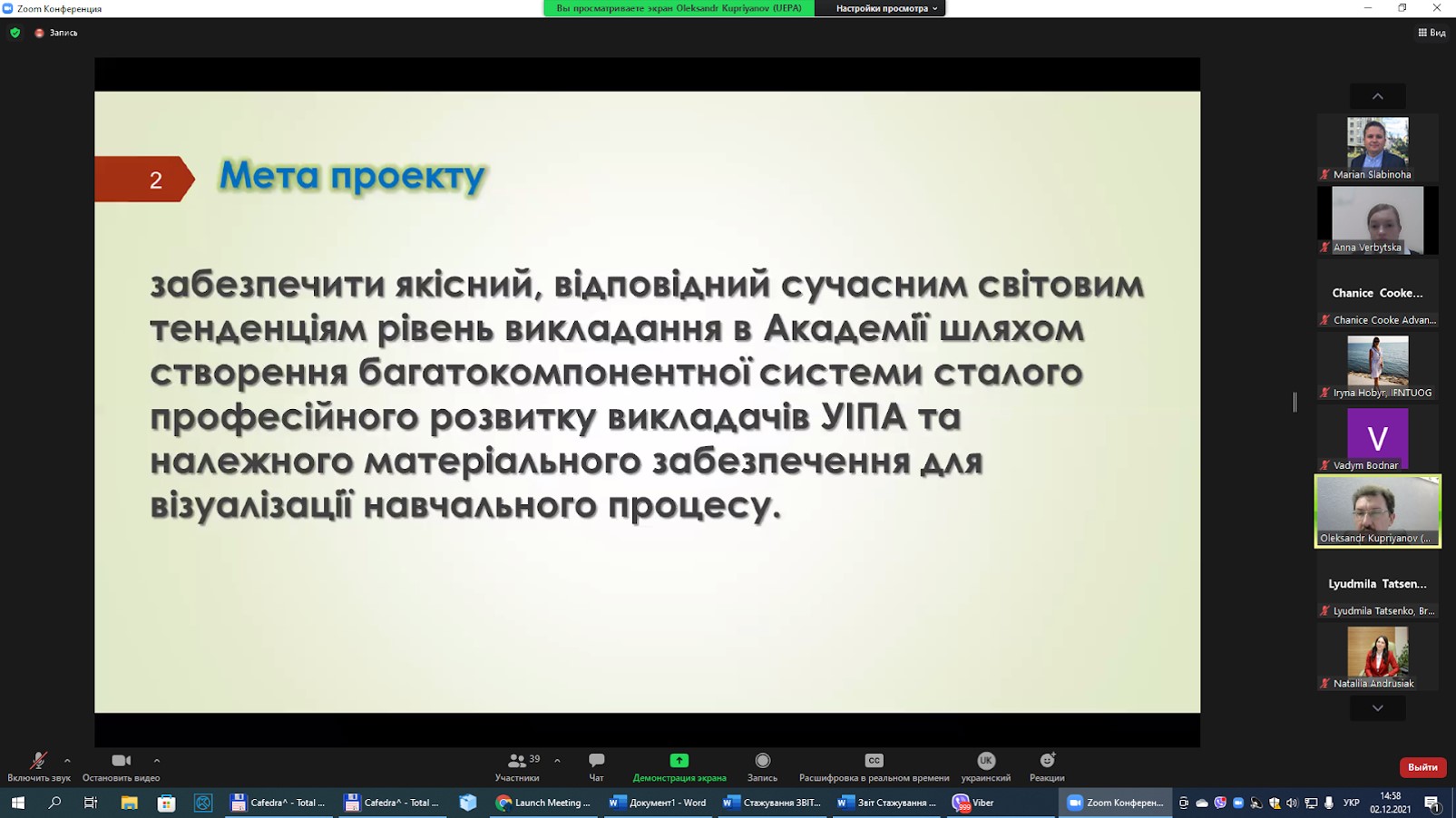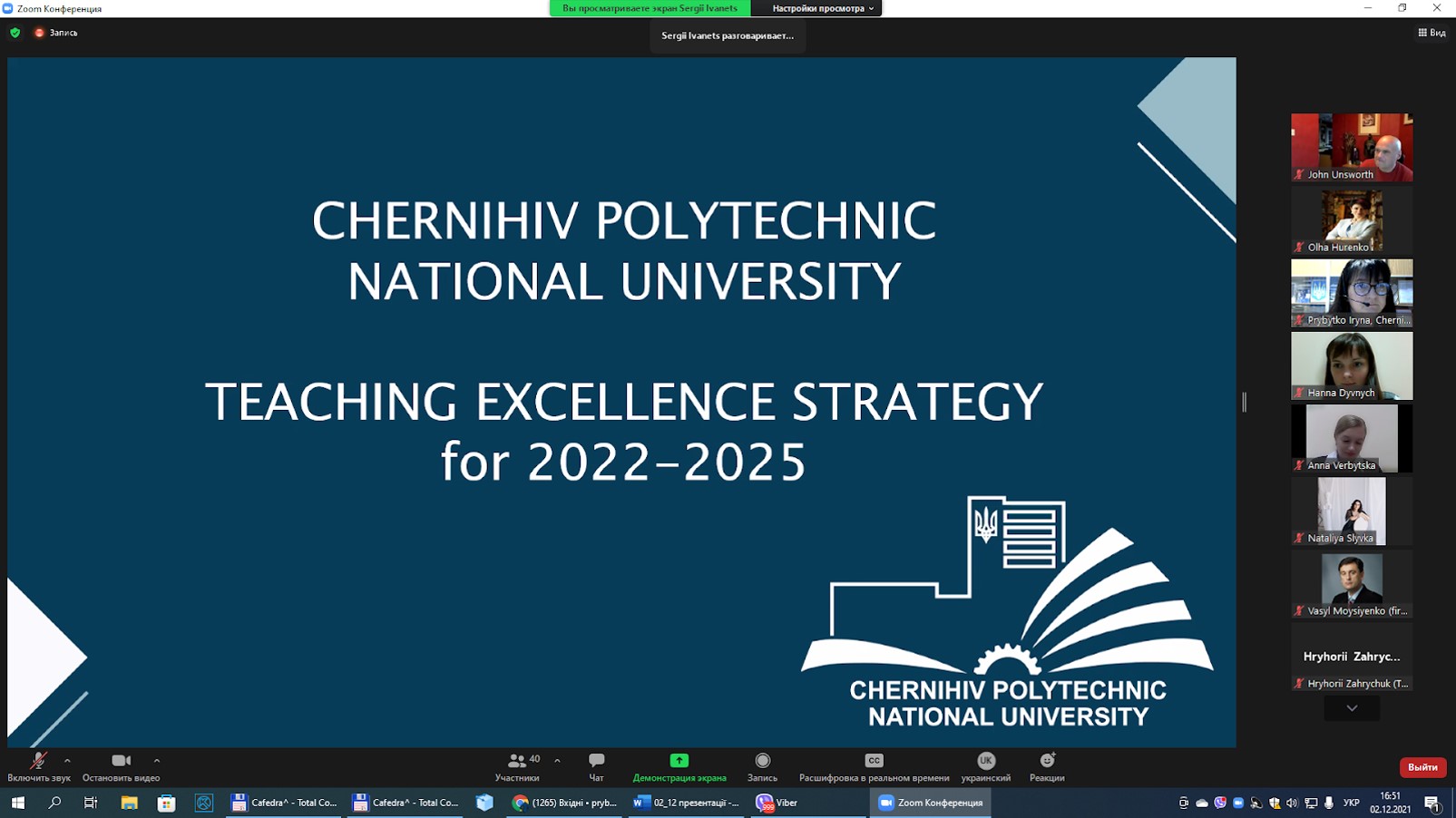 2 грудня 2021 року відбулась остання зустріч компоненту для управлінців Програми вдосконалення викладання від Британської Ради в Україні. Разом з іншими університетами задіяними в програмі, команда НУ “Чернігівська політехніка” презентувала свою стратегію щодо створення власного Центру викладацької майстерності та отримали зворотній зв’язок від колег та запрошеного експерта з Великої Британії.