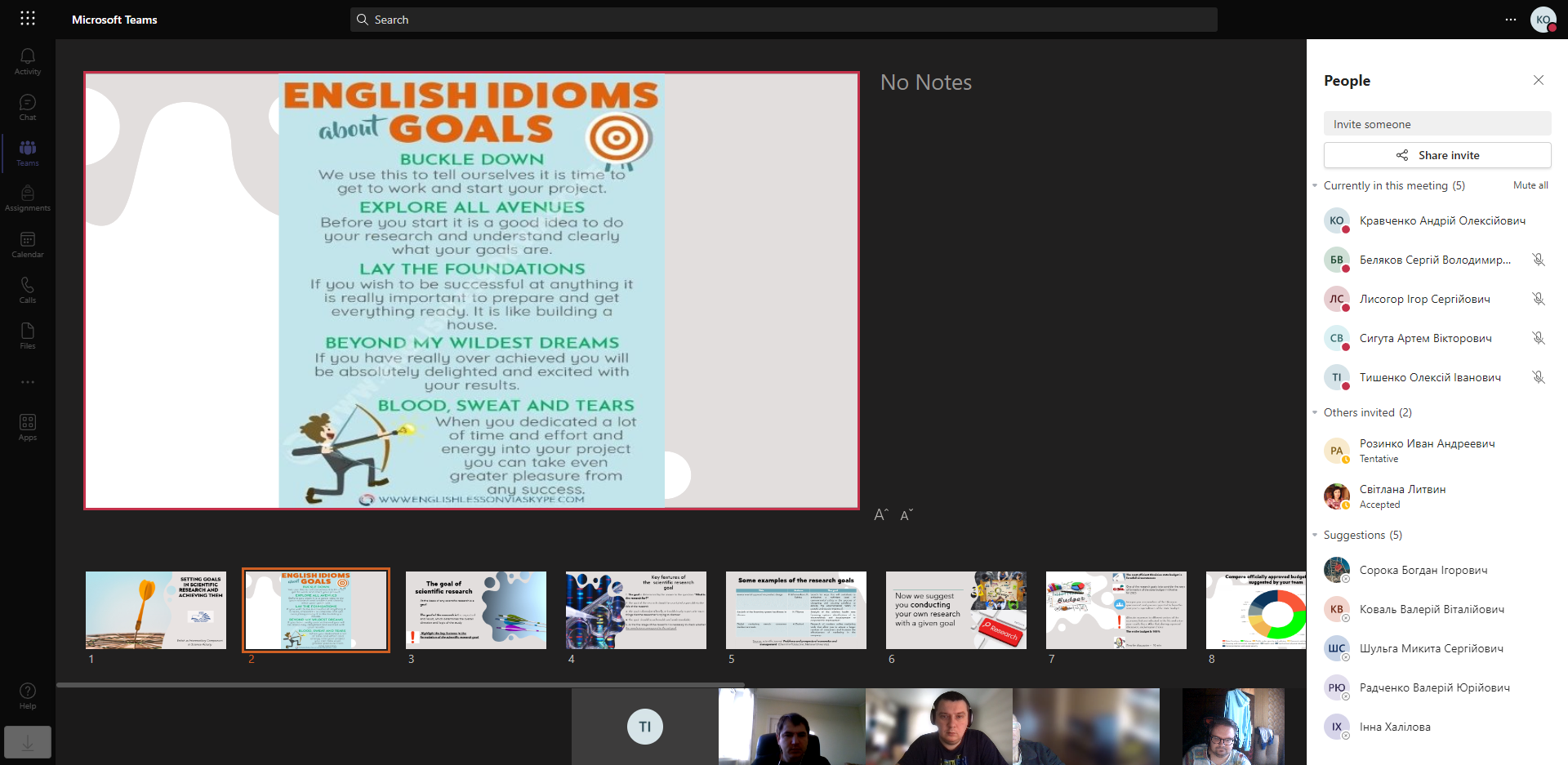 Обраною темою засідання була “Setting Goals in Scientific Research and Achieving Them”. В рамках заявленої теми учасники гуртка були ознайомлені з поняттям цілі наукового дослідження та його ключовими особливостями. Здобувачі вирішували проблемні завдання і обговорювали нагальні потреби суспільства за поточних умов.