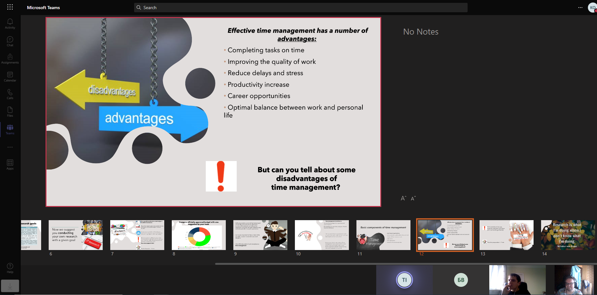 Учасники засідання були також ознайомлені з поняттям та особливостями тайм-менеджменту як одного з основних факторів особистісної дисципліни науковця. В рамках загальної дискусії були обговорені переваги та недоліки тайм-менеджменту. Здобувачі поділилися порадами, особливостями планування та організації власного робочого дня.