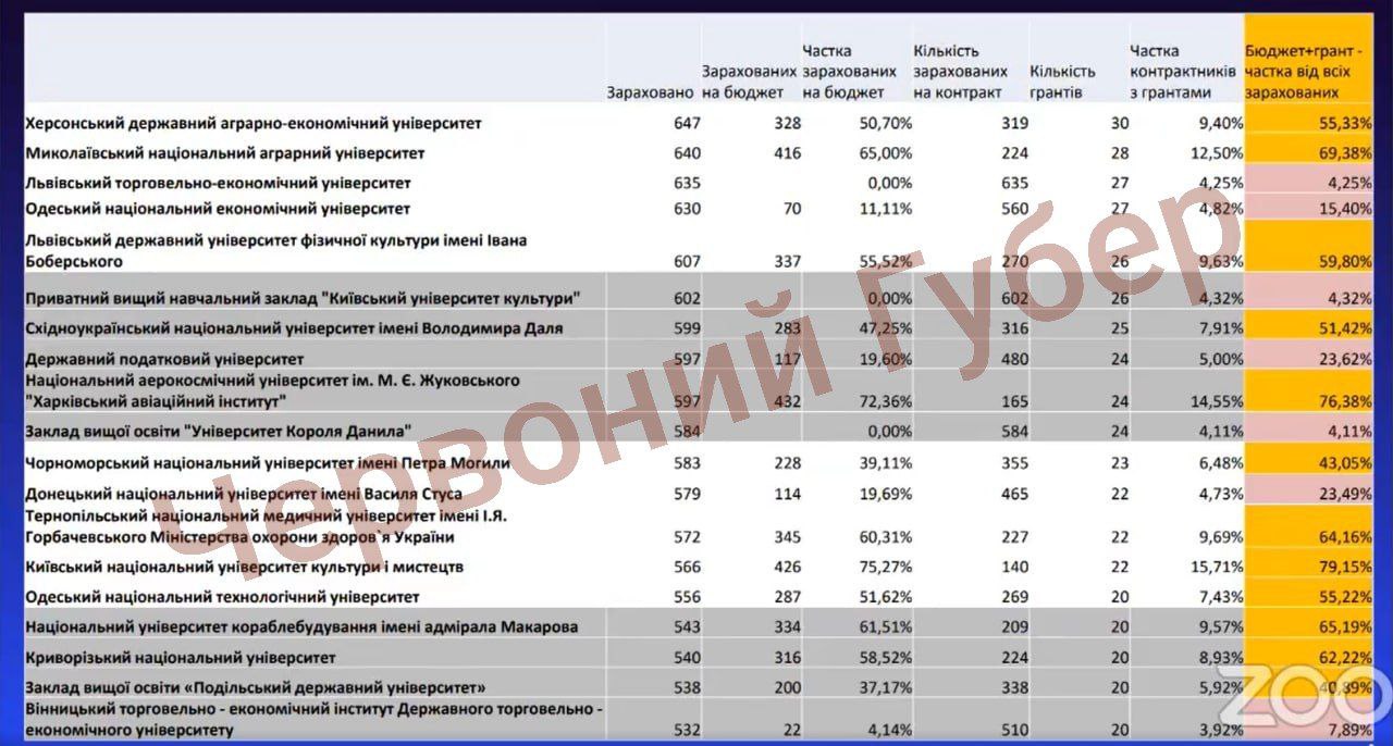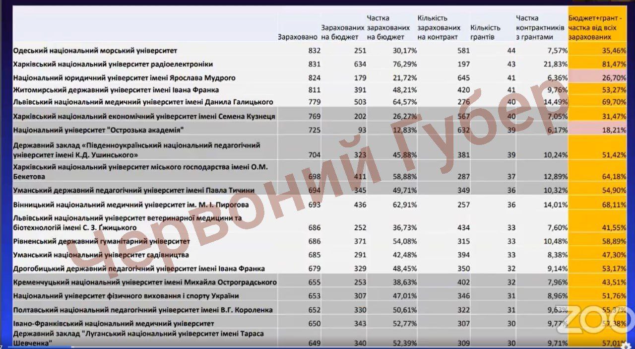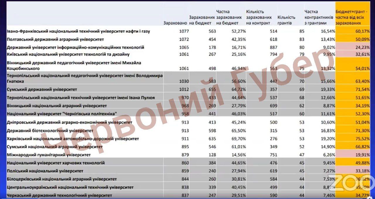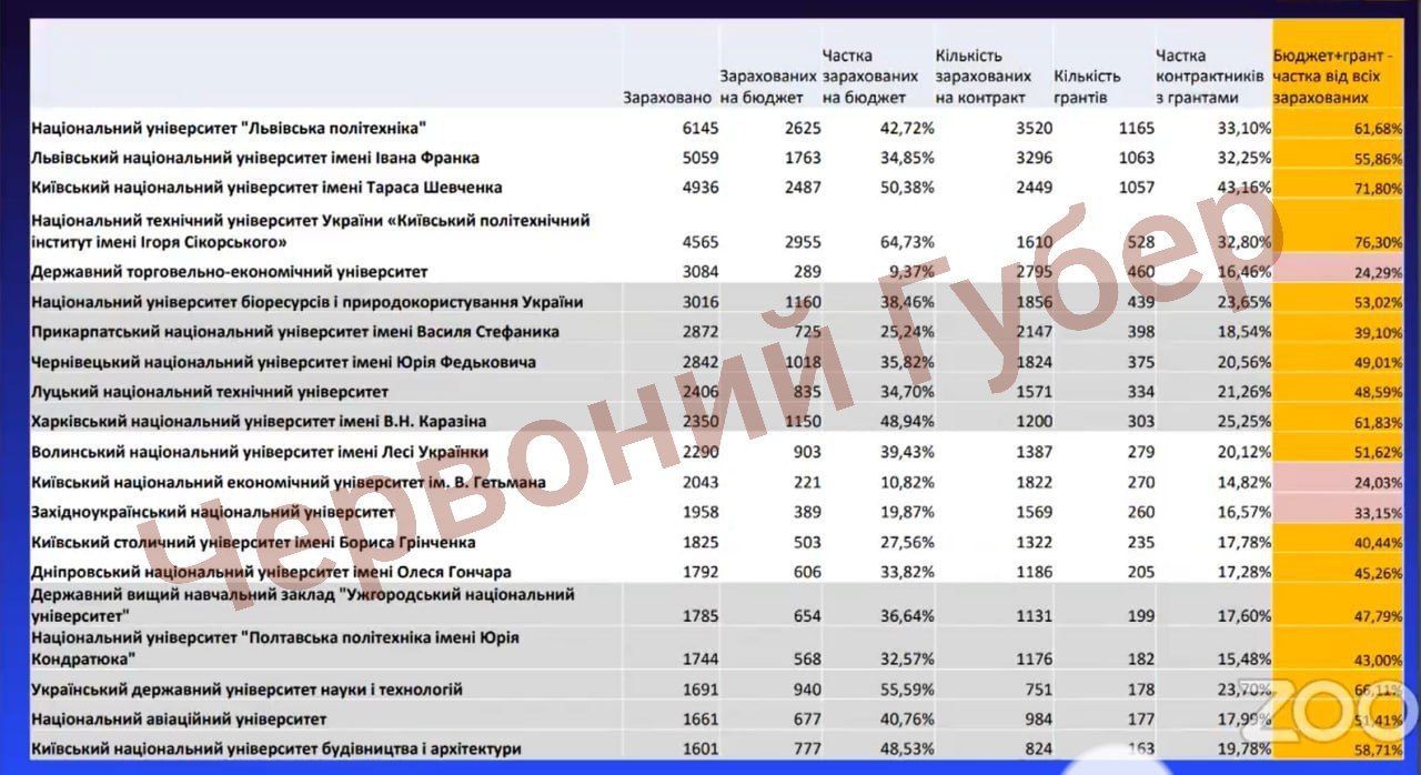Громадська організація «Червоний Губер» https://t.me/chervonyguber опублікувала рейтинг закладів вищої освіти за результатами зарахування на бакалаврат з урахуванням чисельності вступників, які вступили на навчання за кошти державного бюджету України.