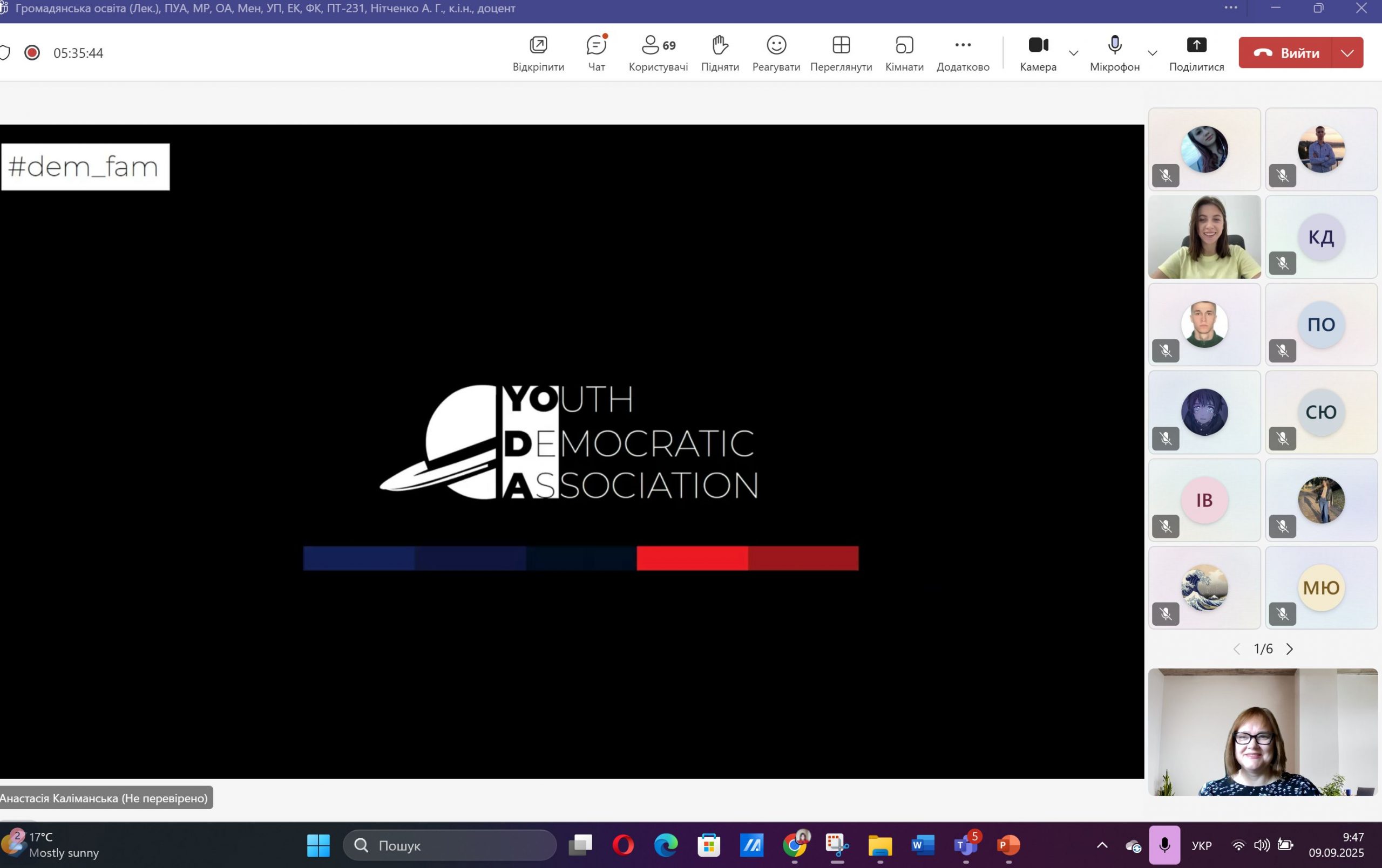9 вересня 2025 року здобувачі вищої освіти Навчально-наукового інституту бізнесу, економіки та адміністрування та Навчально-наукового інституту природокористування та гуманітарних наук, які вивчають інтерактивний курс з громадянської освіти (викладачка – доцентка кафедри правоохоронної діяльності та загальноправових дисциплін Алла Нітченко), взяли участь у презентації молодіжної спільноти #dem_fam та діяльності ДемКлубу на базі нашого університету.