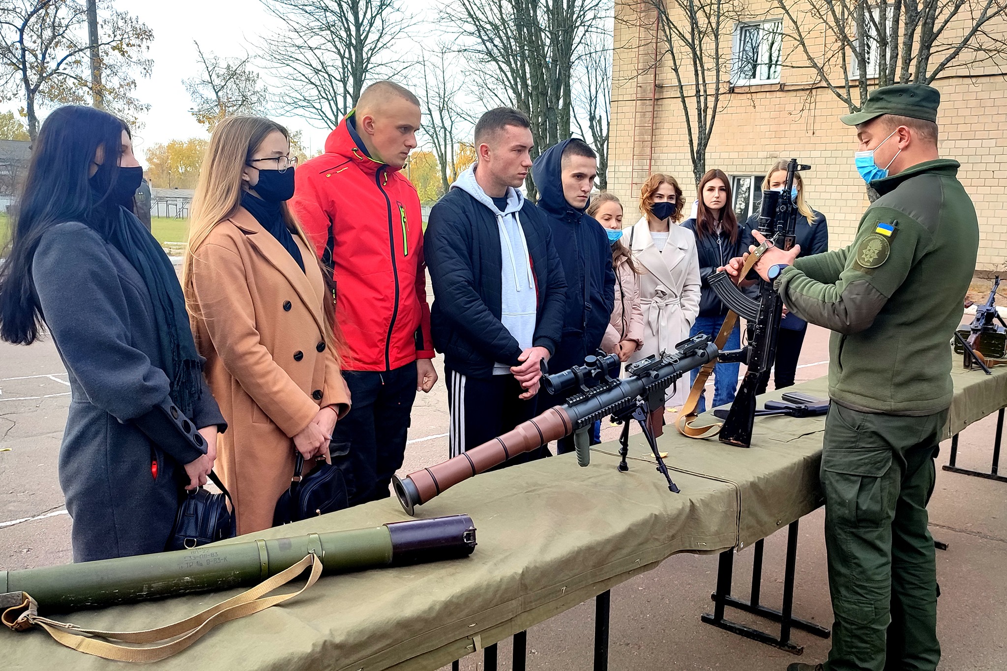 На стройовому плацу частини екскурсантам представили навчальні місця за різними напрямками. Інструктори з бойової підготовки продемонстрували зброю, спецзасоби та екіпіровку, яка застосовується під час служби. Фахівці з тактичної медицини провели для студентів заняття з надання першої домедичної допомоги, де показали як правильно тампонувати рани та використовувати джгут-турнікет при кровотечі.