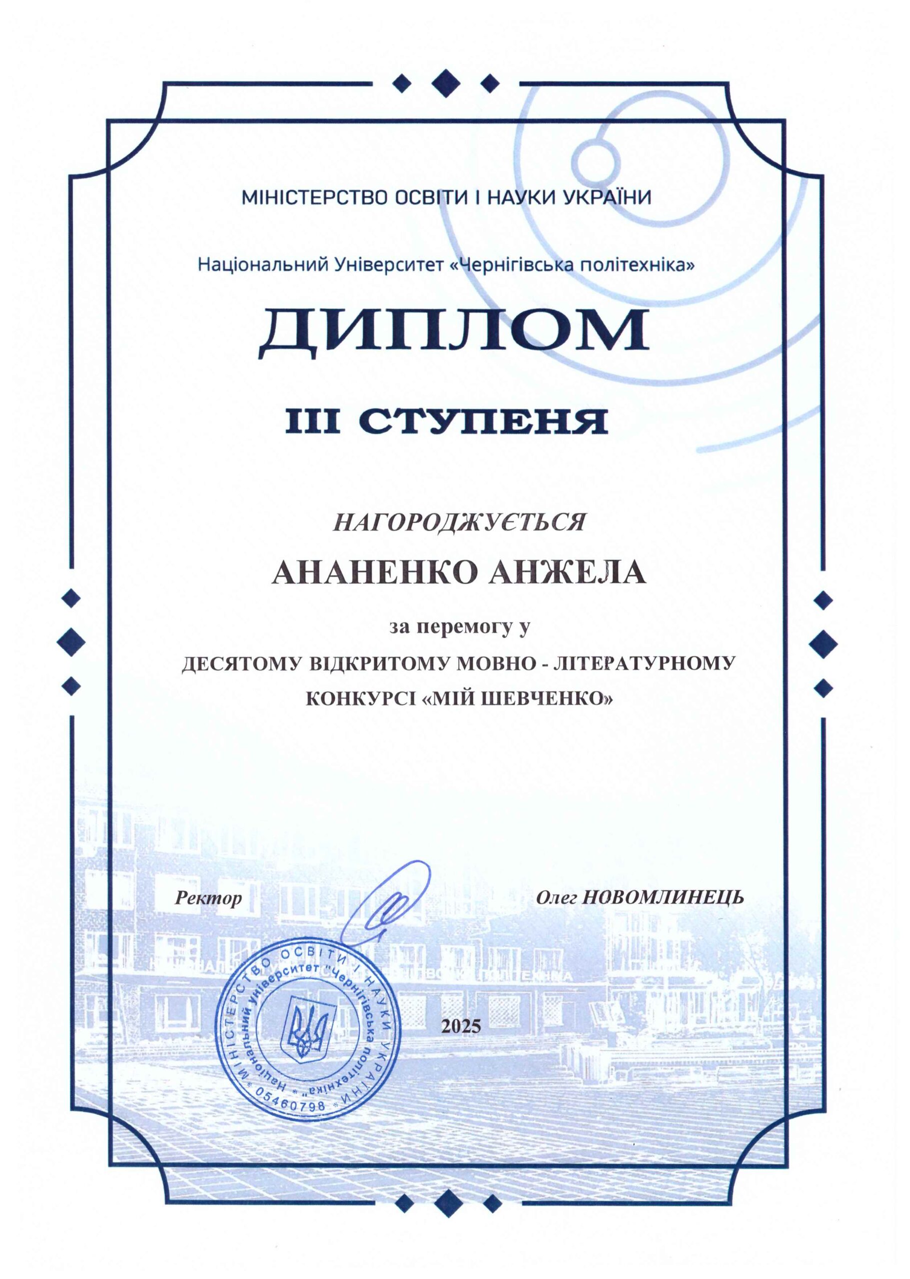 Диплом III ступеня – Ананенко Анжела, ОПП «Кримінальна юстиція (Суд. Прокуратура. Адвокатура)», група КЮ-231.