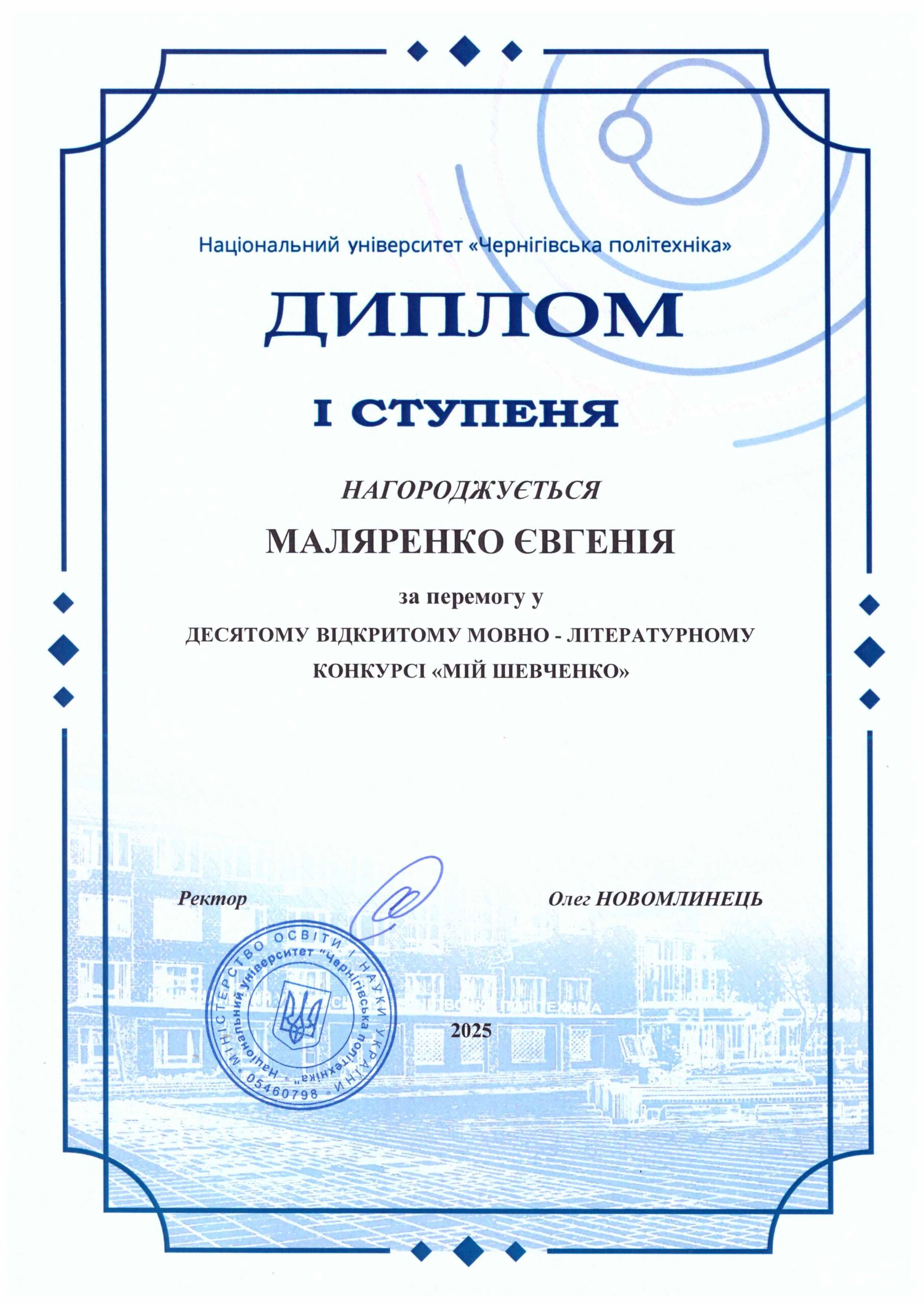 Диплом I ступеня – Маляренко Євгенія, ОПП «Соціальна робота», група СР-231.