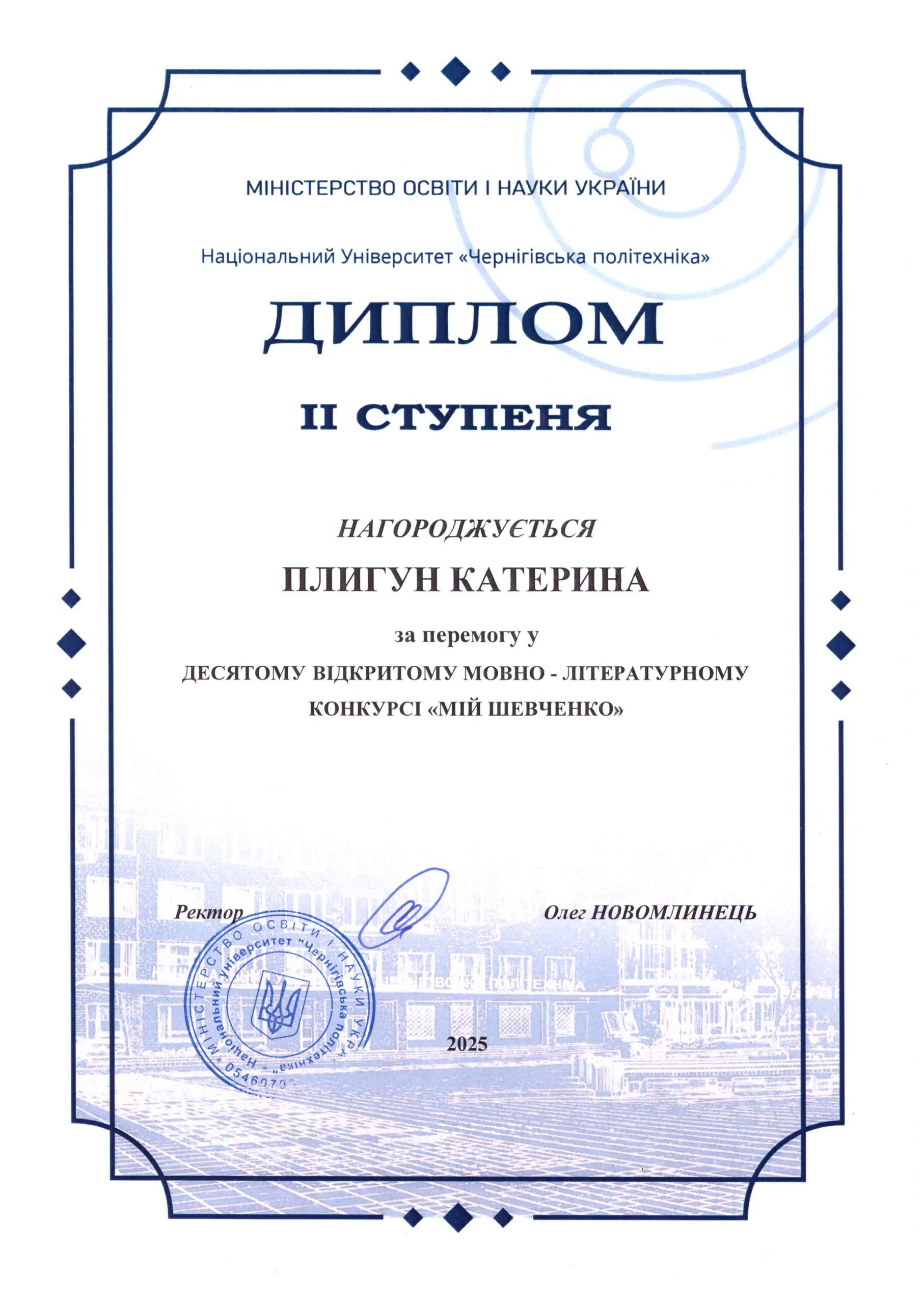 Диплом II ступеня – Плигун Катерина, ОПП «Кримінальна юстиція (Суд. Прокуратура. Адвокатура)», група КЮ-231.