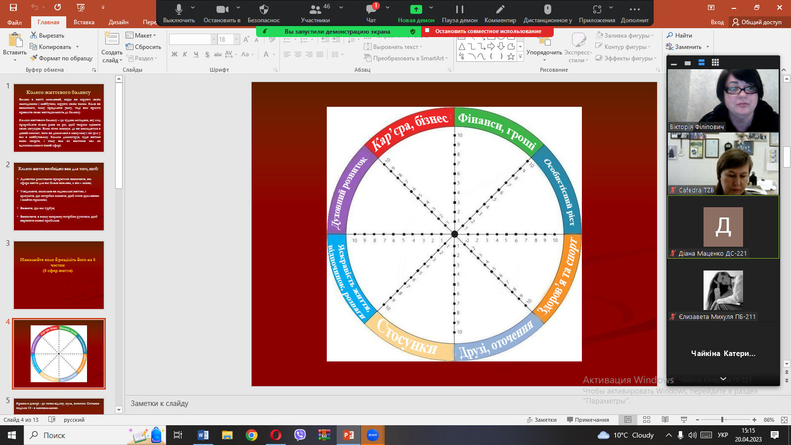 Філіпович В.М. провела онлайн зустріч «Колесо життєвого балансу – корисна практика для аналізу свого життя». Учасники зустрічі дізнались, що дана техніка дозволяє оцінити свою задоволеність у всіх сферах життя, і мали можливість побачити цілісну картину свого життя, в результаті чого з’явиться розуміння, куди рухатися в першу чергу для досягнення особистих цілей.